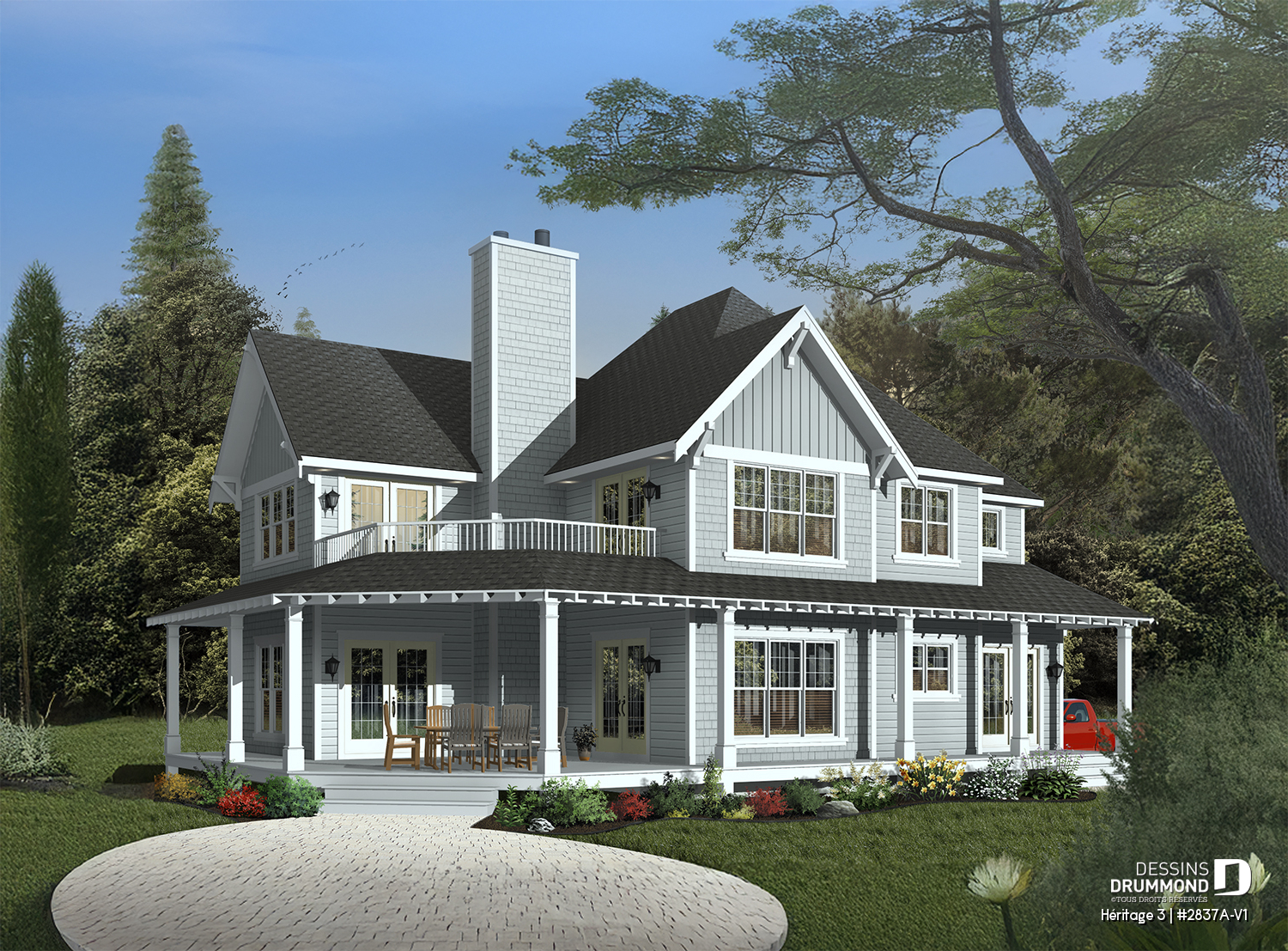 • Vue avant - MODÈLE DE BASE - Plan maison champêtre, 3 chambres, garage double, 2 salons, foyer, plusieurs terrasses - Héritage 3