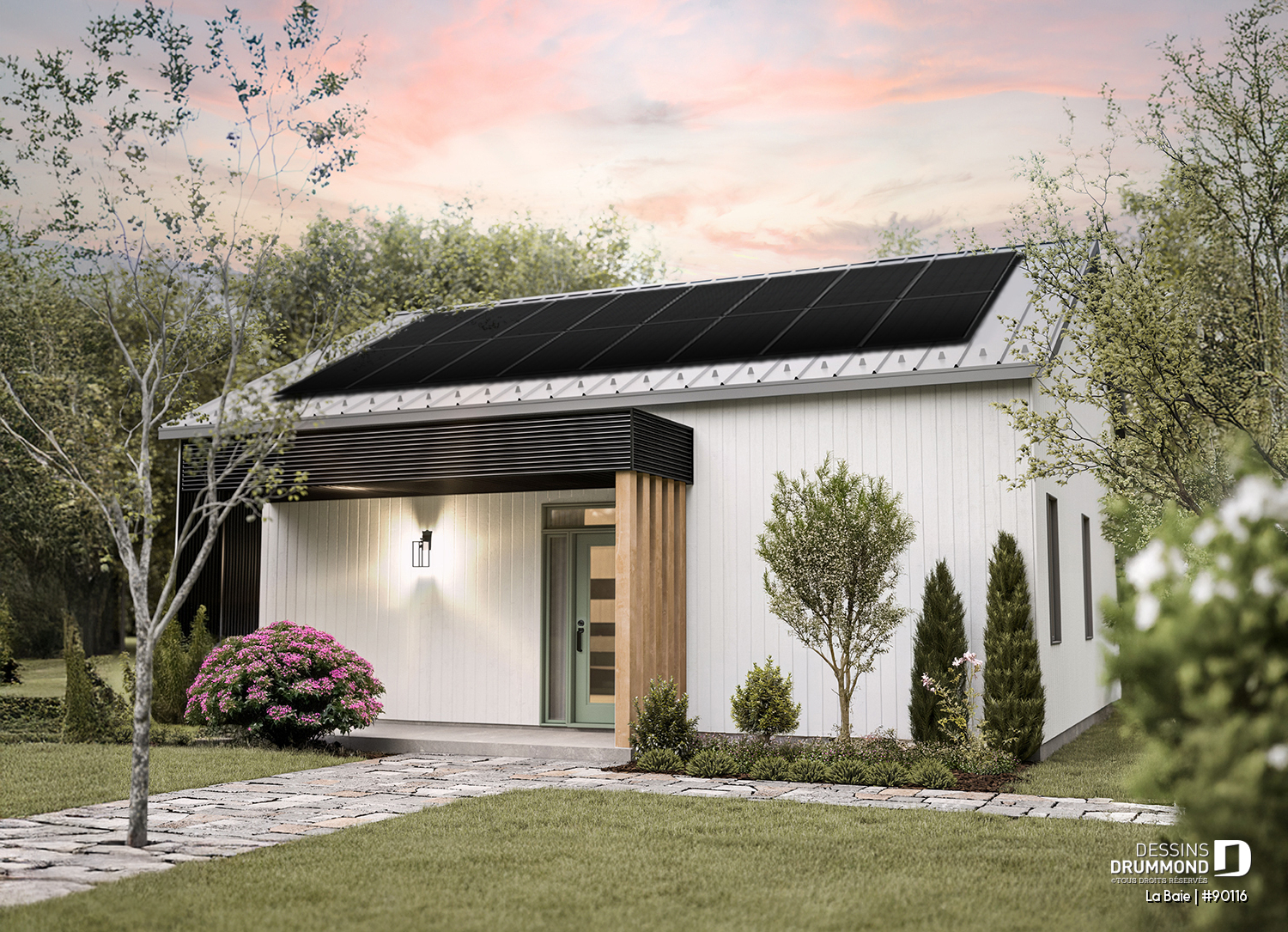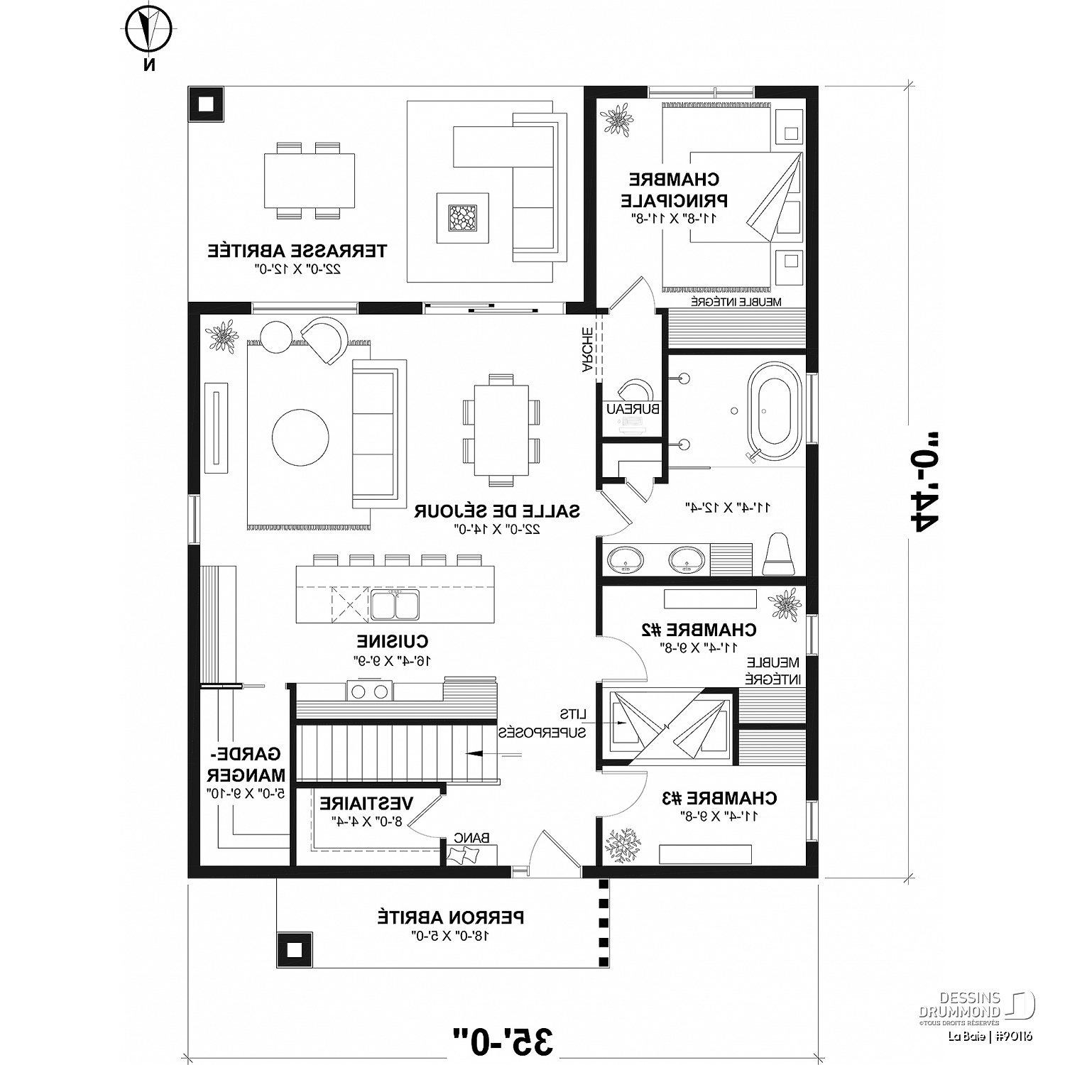 Créé pour être sur un terrain dont le sud est situé à l’arrière, la maison La Baie (plan #90116) vous offre tout ce dont une famille a besoin dans un espace maximisé. Avec ses plafonds de 9’-0’’ de haut, vous ne vous sentirez jamais à l’étroit dans cette maison. À l’entrée, vous retrouverez sur votre droite le vestiaire qui comprend un espace pour la laveuse et la sécheuse. Au fond de cette pièce se trouve l’accès pour la salle mécanique. En vous dirigeant vers l’arrière de la maison, vous entrerez dans l’aire ouverte qui baignera dans la lumière naturelle. Un grand îlot vous permettra de recevoir votre famille et vos amis tout en étant un centre de l’action. À partir de la salle à manger, vous pouvez accéder à la grande terrasse couverte située à l’arrière de la maison.