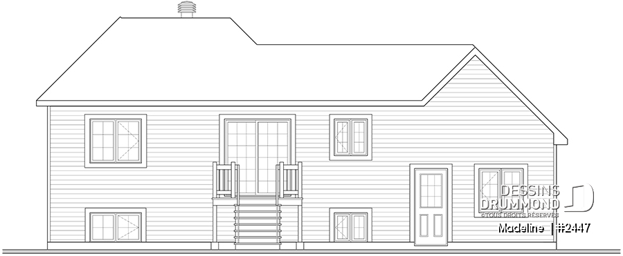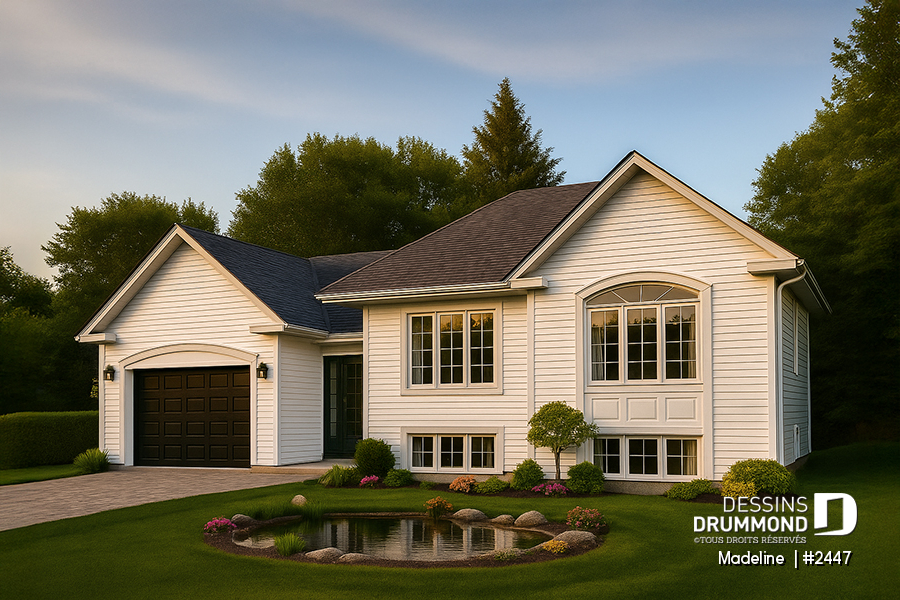 • Vue avant - MODÈLE DE BASE - Plan de maison à entrée split, économique, garage avec rangement, 2 à 4 chambres, s-sol aménagé optionnel ($) - Madeline