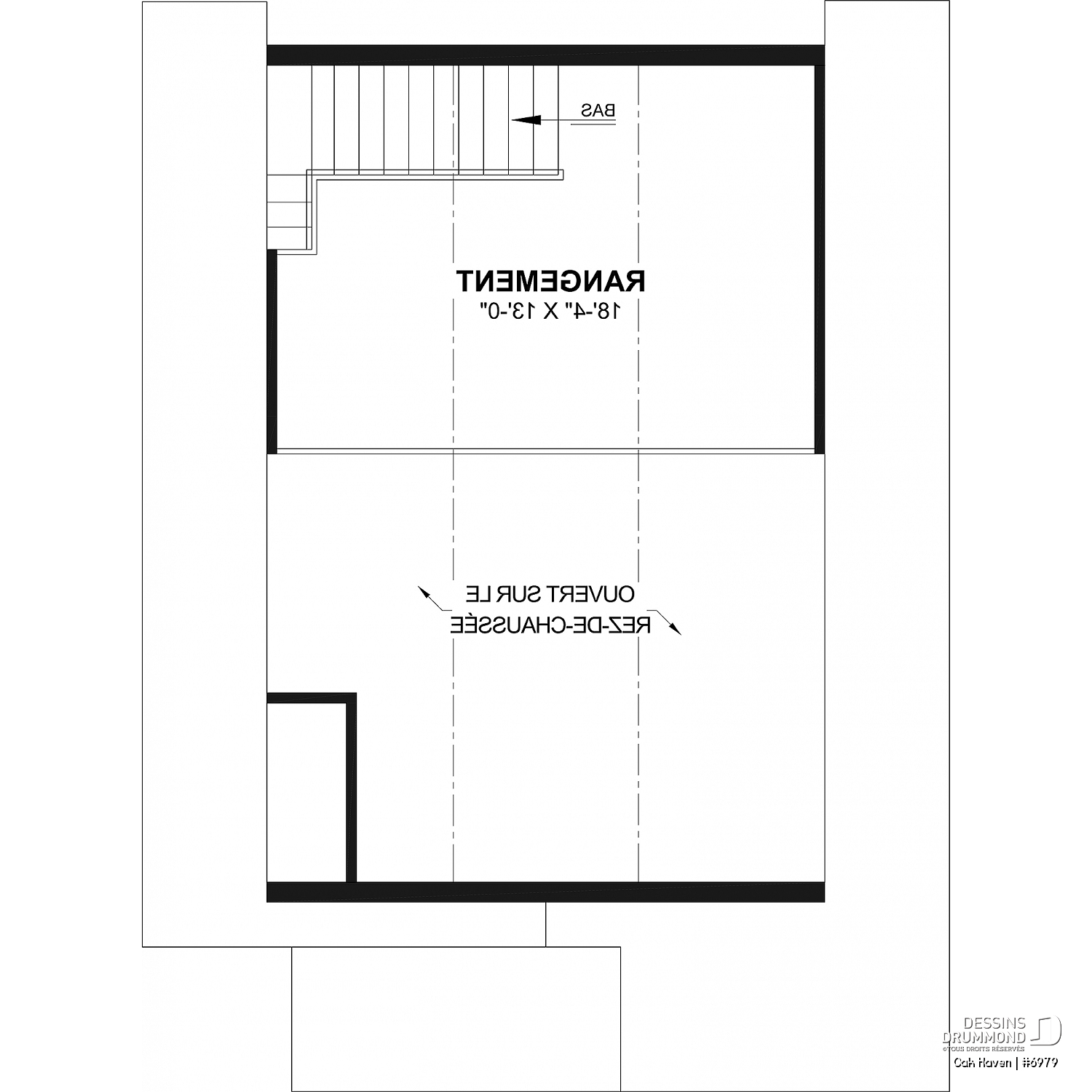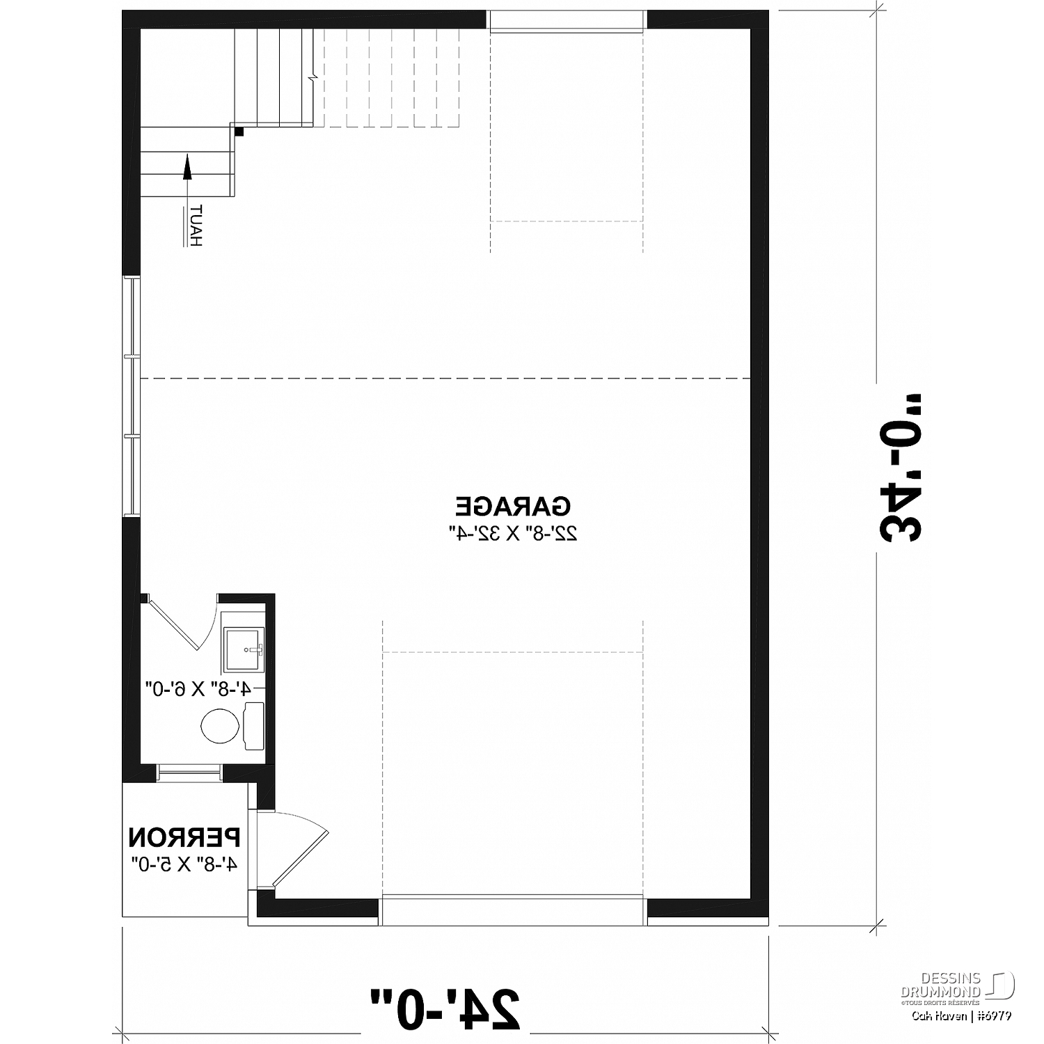 Plan de garage pour une voiture. 791 pi.ca. au rez-de-chaussée et 202 pi.ca. à l'étage pour rangement accessible par escalier. Pratique salle d'eau au rez-de-chaussée. Étage avec mezzanine et plafond en pente, et ouvert sur le rez-de-chaussée. Format de 24' x 34'. Fondation: dalle flottante. Autres types de fondation disponibles.