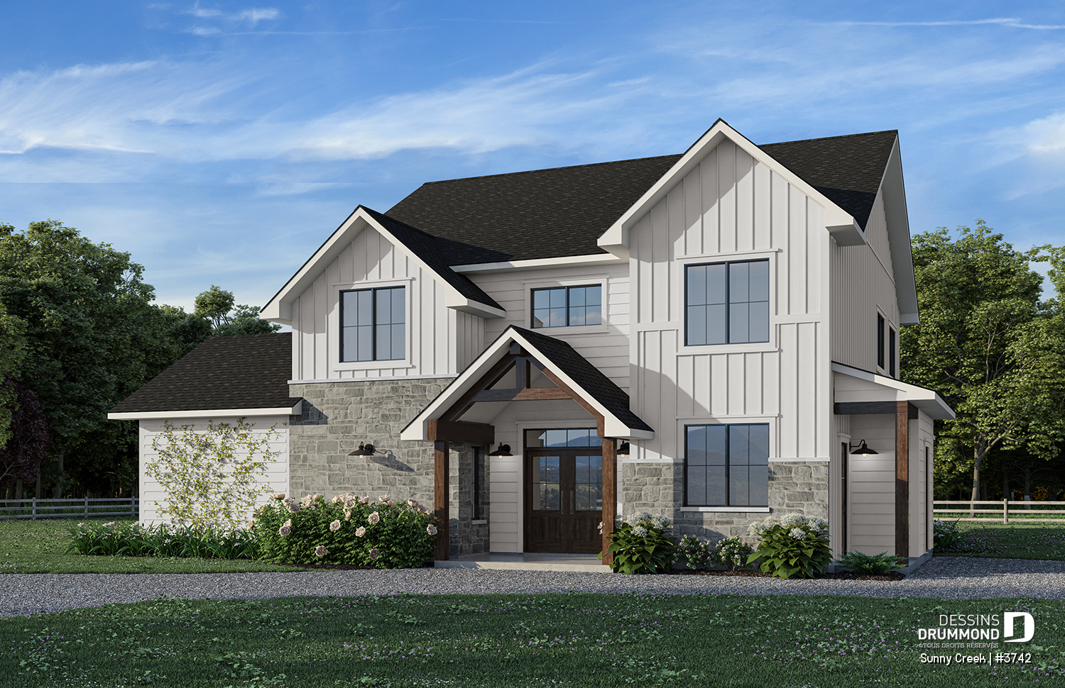 Découvrez ce magnifique plan de maison à étage de style Farmhouse, pensé pour allier charme rustique et confort moderne. Dès le premier regard, sa façade harmonieuse séduit par la combinaison élégante de pierres et de revêtement board & batten, offrant à la fois authenticité et raffinement. Cette allure semi-rustique s’intègre à merveille dans un cadre champêtre ou résidentiel et promet un coup de cœur assuré pour tous ceux qui franchiront votre allée.