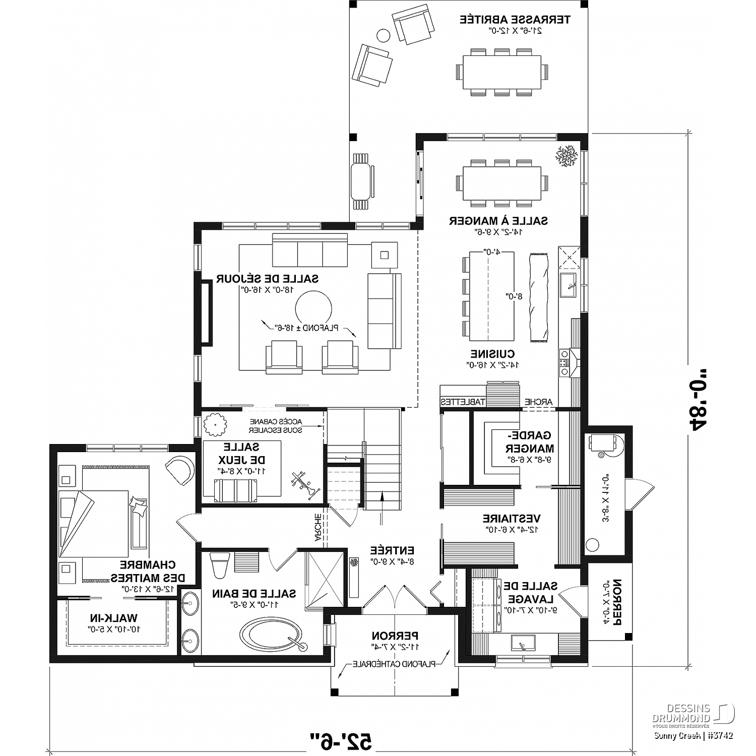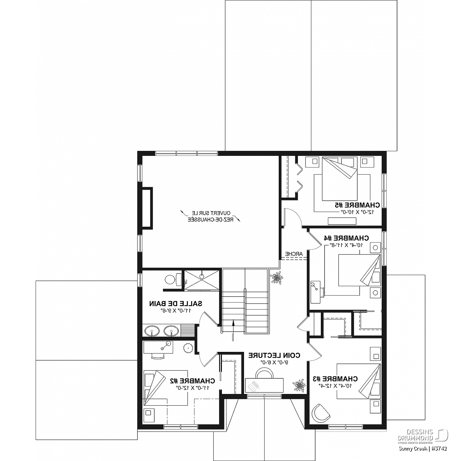 Rez-de-chaussée: Entrée avant, vestiaire, salle de lavage, entrée latérale, cuisine, garde-manger, salle à dîner, salle de séjour, salle de jeux, chambre des maîtres, salle de bain. Étage: 4 chambres, salle de douche, coin lecture. Terrasse arrière abritée. Fondation: dalle flottante, plusieurs types de fondation disponibles pour chacun de nos plans.