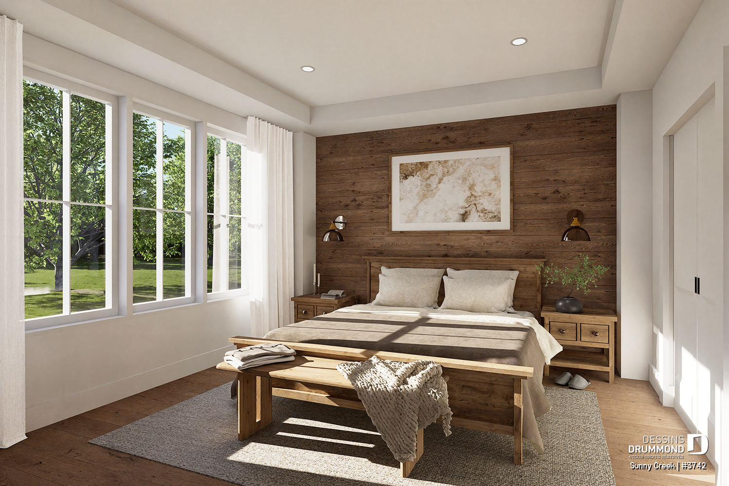 Chambre des maîtres au rez-de-chaussée avec walk-in et accès à une salle de bain complète.