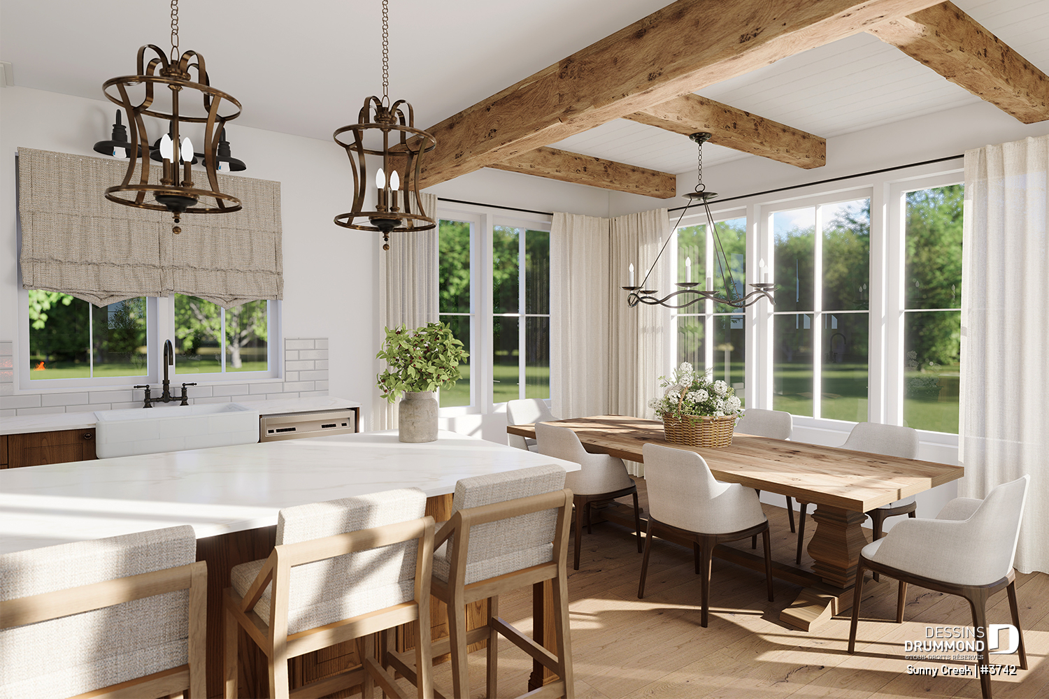 Espace à aire ouverte reliant cuisine, salle à dîner et salle familiale pour des moments chaleureux en famille.
