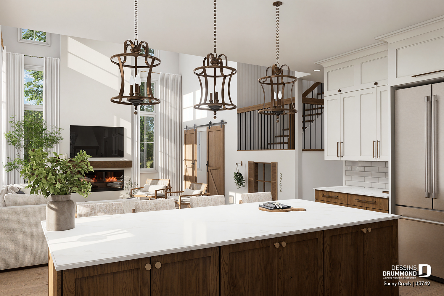 La cuisine moderne et fonctionnelle constitue le cœur de la maison. Son grand îlot convivial est parfait pour cuisiner en famille, partager un café ou recevoir des amis. Ouverte sur la salle à dîner et la salle familiale, elle crée un espace à aire ouverte chaleureux où les rires et les échanges se mêlent naturellement. Juste à côté, la salle de lavage discrètement retirée rend le quotidien plus simple et organisé.