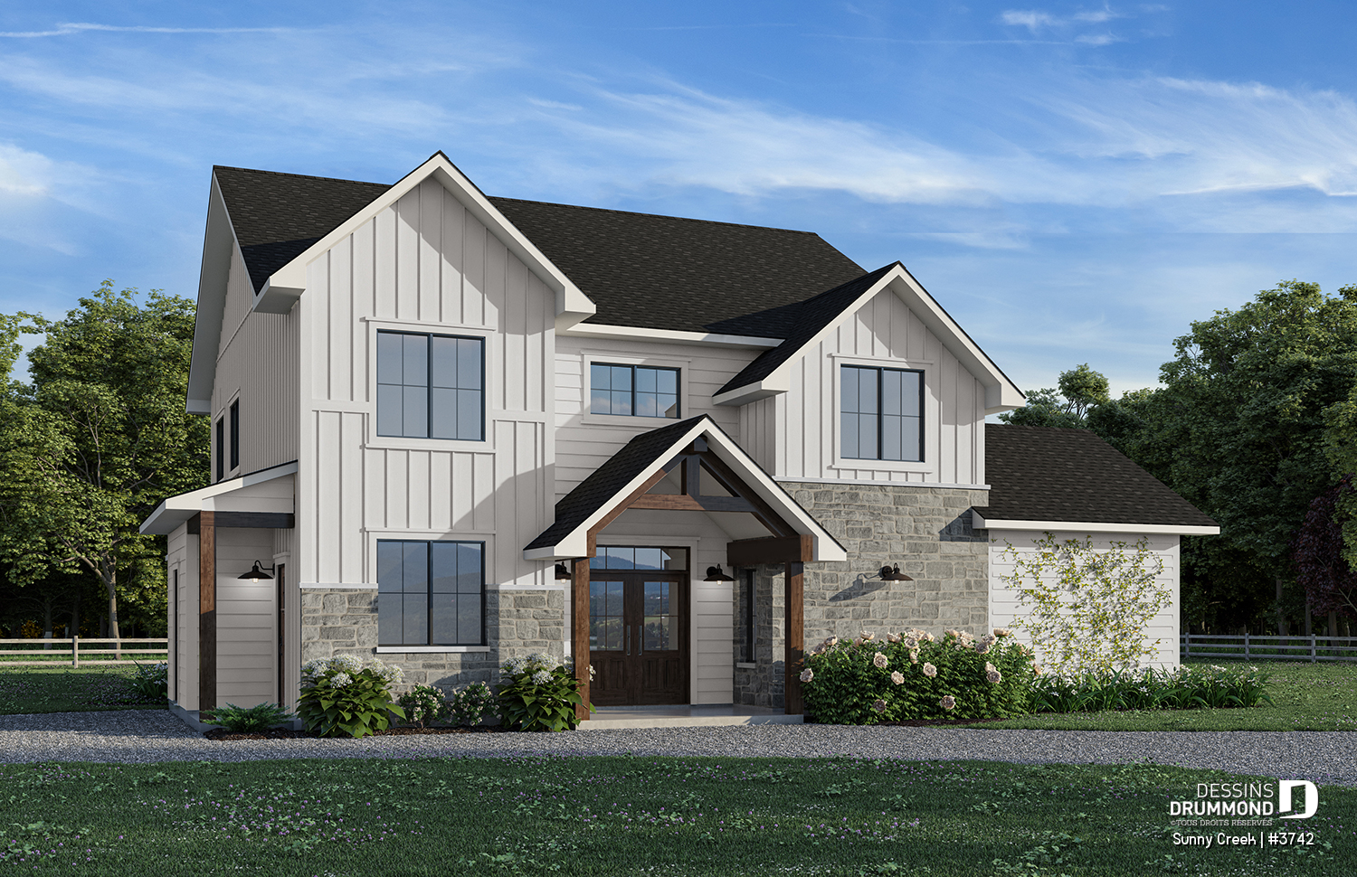 Façade combinant pierres et board & batten pour un charme semi-rustique.