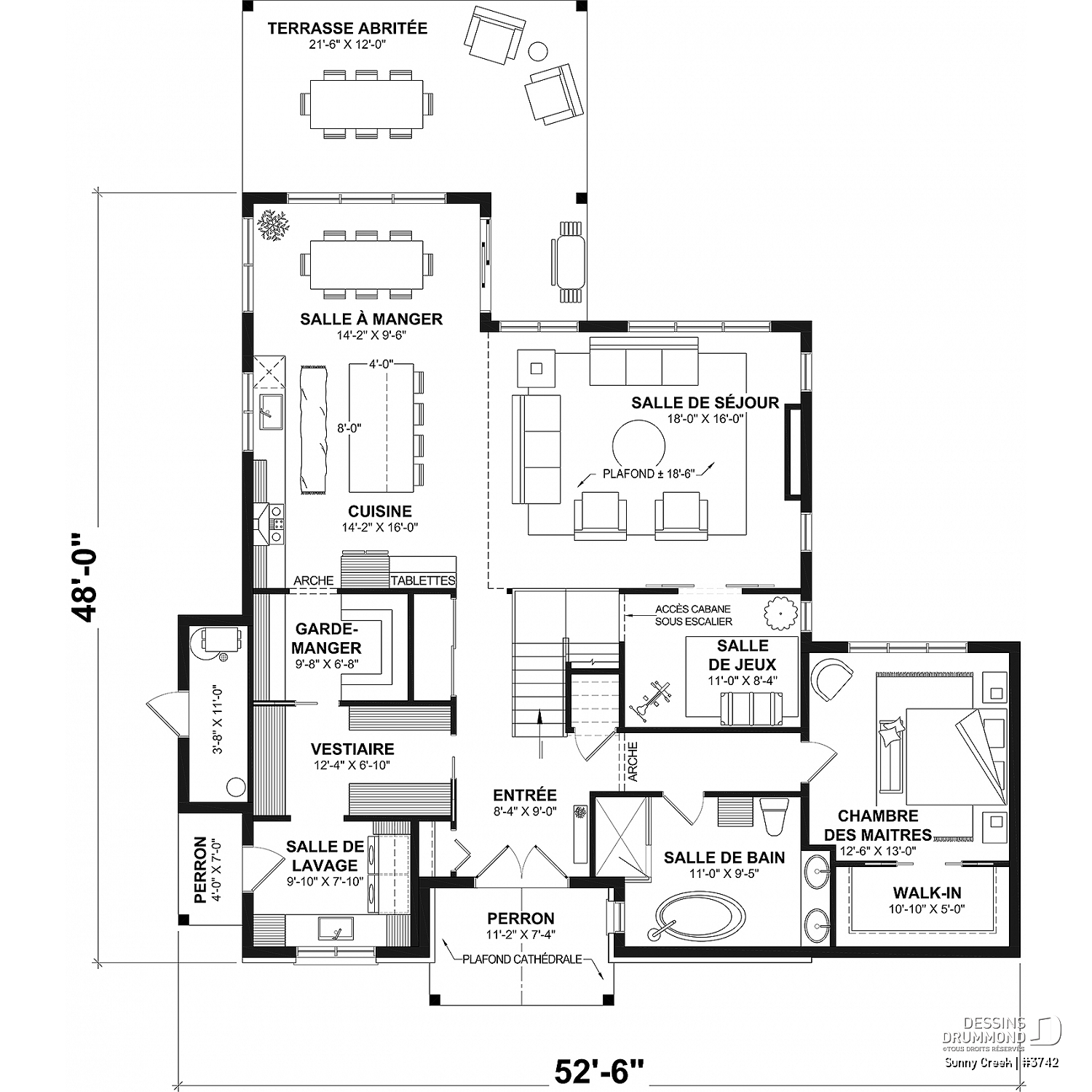 Rez-de-chaussée: Entrée avant, vestiaire, salle de lavage, entrée latérale, cuisine, garde-manger, salle à dîner, salle de séjour, salle de jeux, chambre des maîtres, salle de bain. Étage: 4 chambres, salle de douche, coin lecture. Terrasse arrière abritée. Fondation: dalle flottante, plusieurs types de fondation disponibles pour chacun de nos plans.
