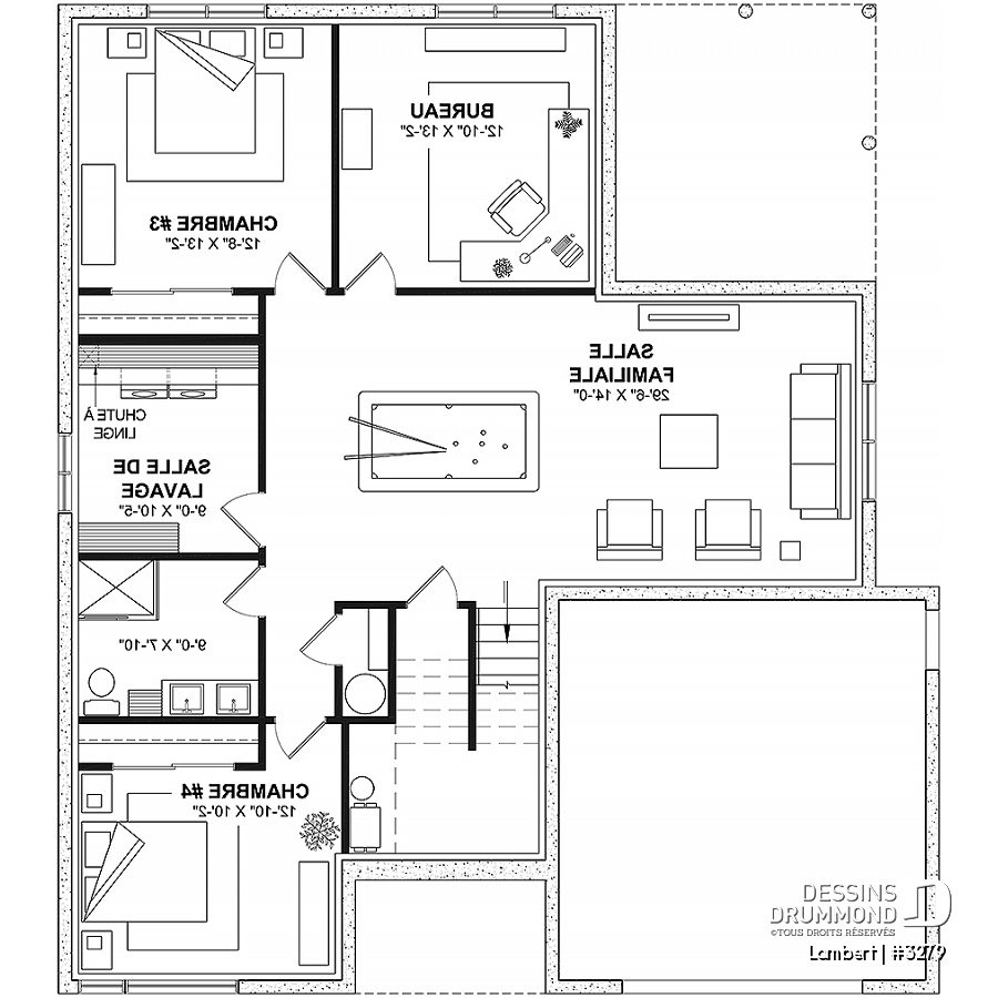 2 chambres additionnelles, une salle familiale, la salle de lavage, une salle de douche et un bureau (ou chambre #5) sont prévus au sous-sol.