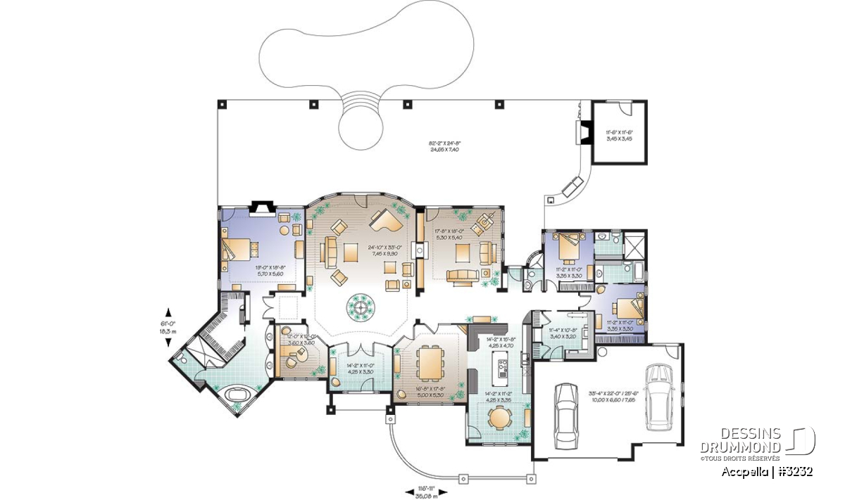 Entrée remarquable avec plafond à 14 pi et retombée. Superbe salle familiale avec fontaine intérieure et plafond à 11 pi aussi avec retombée. Salle à manger avec plafond à 16 pi et retombée. Cuisine avec plafond à 13 pi et retombée. Plafond à 10 pi partout ailleurs avec retombée à la chambre des maîtres, la salle de séjour et au bureau. Fenestration abondante sur l'arrière et vaste patio couvert avec spa intégré, cuisine extérieure, foyer ou bbq et rangement approprié. Mobilier encastré ou rangement encastré à la salle de séjour, la chambre des maîtres et la buanderie. Foyer mitoyen à la salle de séjour et la salle familiale. Autre foyer prévu à la suite chambre des maîtres. Cuisine et dînette donnant sur l'avant avec sortie sur patio extérieur. Garage triple.