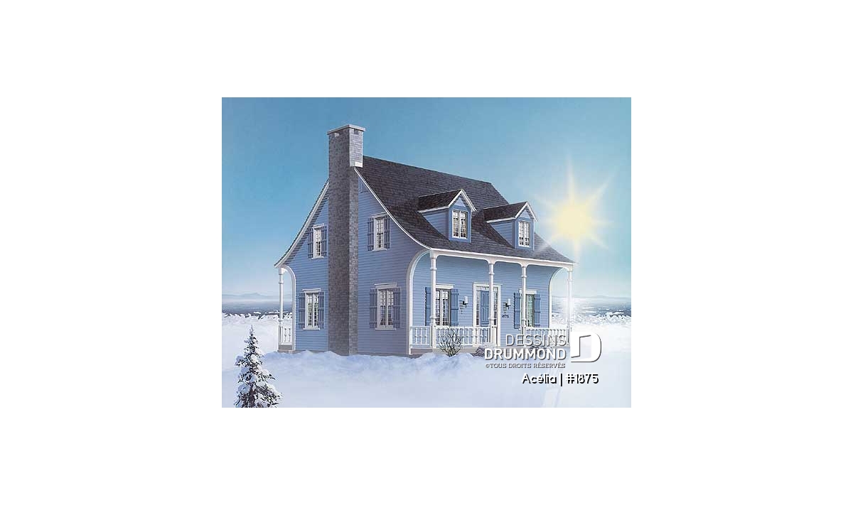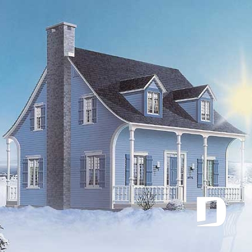 Plan de maison canadienne 3 chambres, avec lucarnes, foyer au salon, buanderie au premier, boudoir