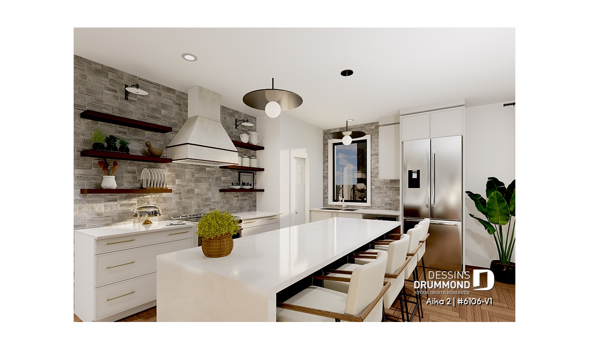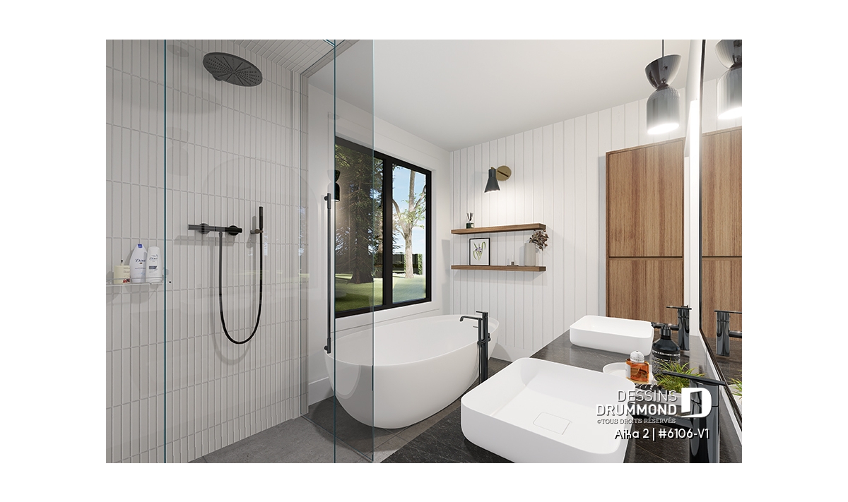 Un atout majeur du plan Aika 2 (6106-V1) est sa suite des parents située au rez-de-chaussée, offrant confort et intimité. Celle-ci comprend un grand walk-in, une salle de bain privée avec deux lavabos, ainsi qu’un bain et une douche séparés. Une salle d’eau pratique, intégrant une laveuse et une sécheuse superposées, complète intelligemment ce niveau.