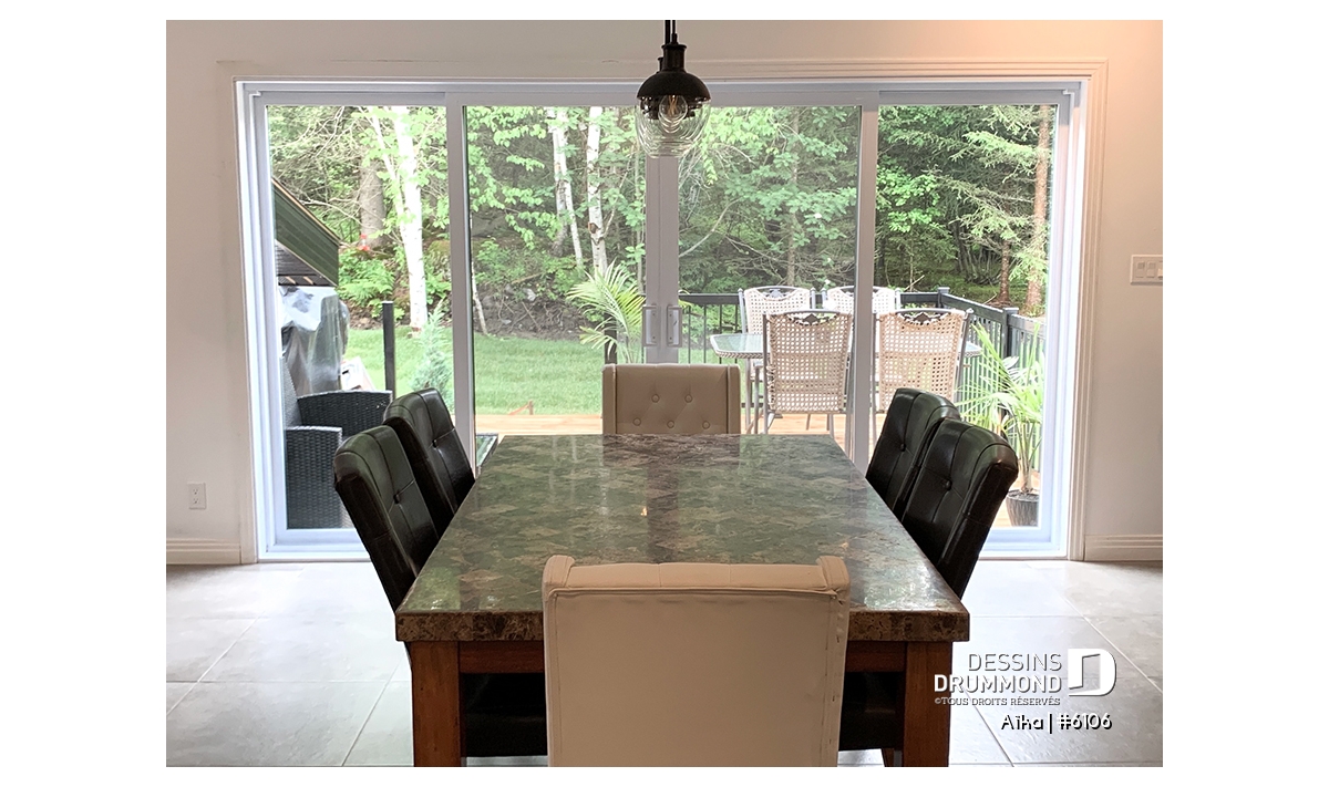 Cuisine, salle à manger et salon à aire ouverte et avec belle fenestration.