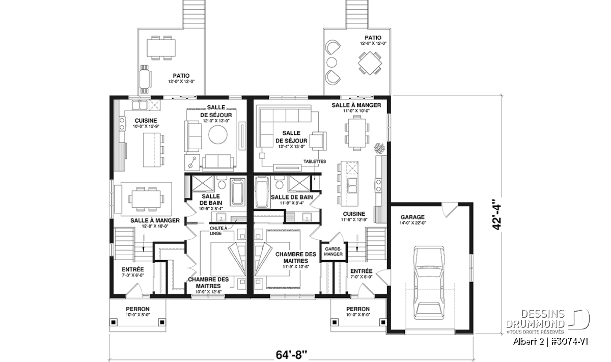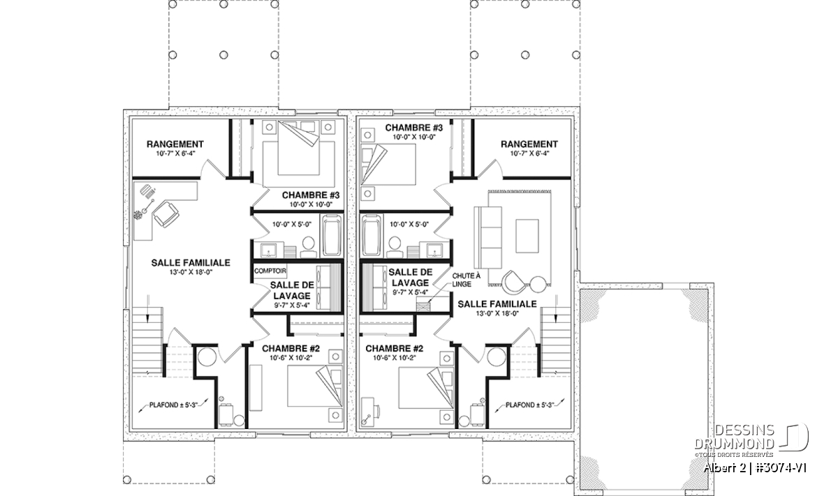 Modèle de jumelé avec garage d'un côté, 3 chambres et 2 salles de bain par unité, aire ouverte