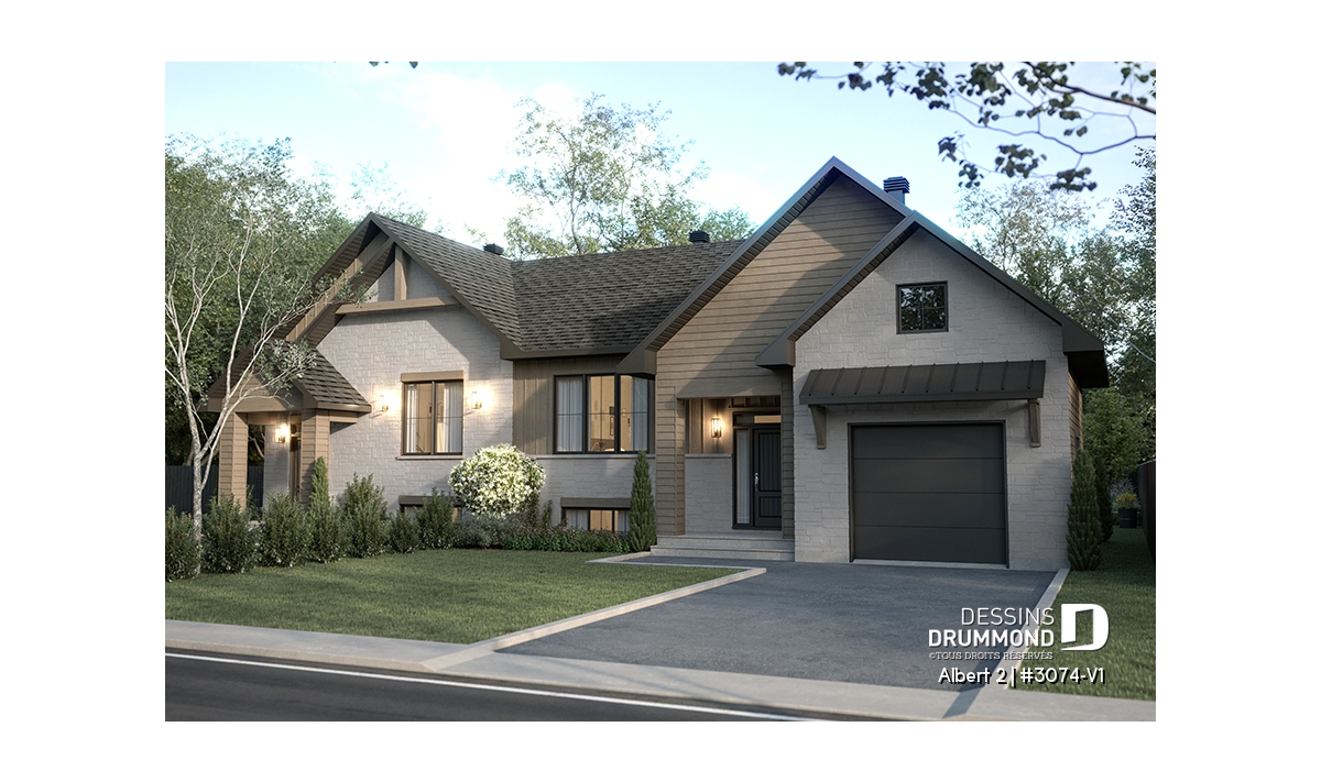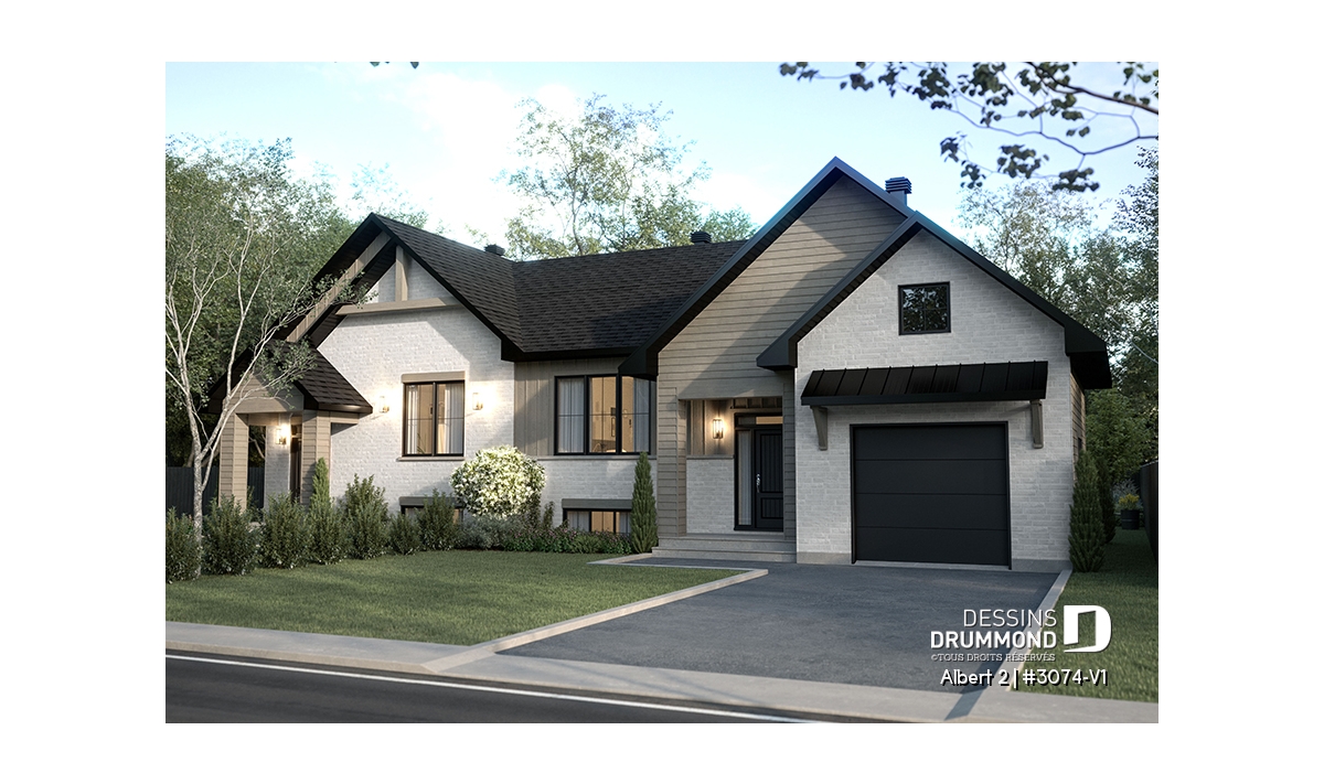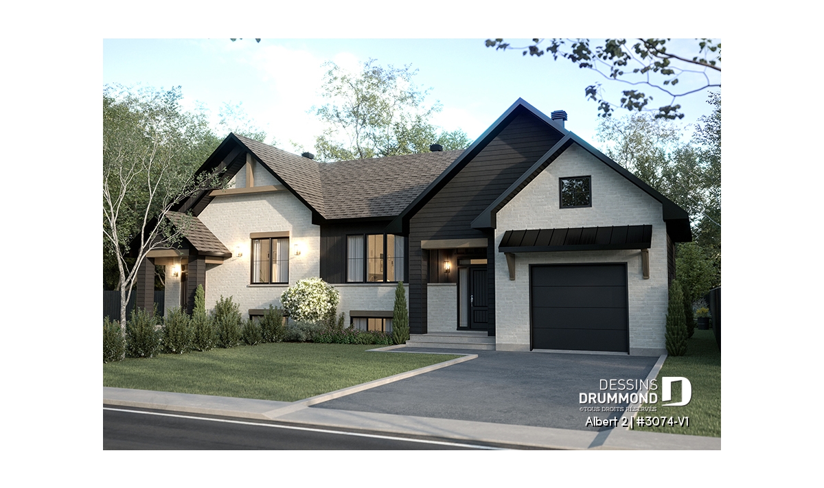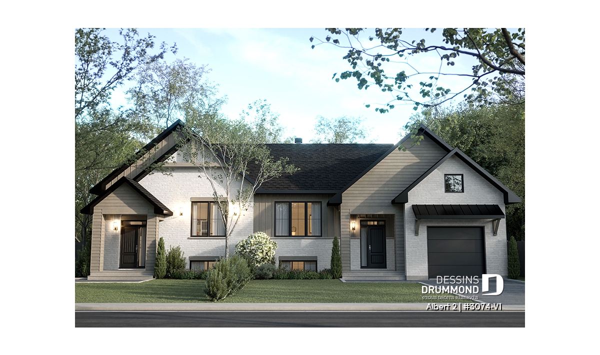 Le plan de maison ALBERT 2 (plan de jumelée #3074-V1) propose un total de 3600 pi.ca. aménagés au rez-de-chaussée et au sous-sol entièrement fini. Chacun des logements comporte donc 1800 pi.ca. aménagés au rez-de-chaussée et sous-sol fini. La grande différence versus son modèle d'origine (ALBERT) réside dans le garage qui a été ajouté à l'unité de droite. Le style moderne et rustique à la fois saura attirer l’œil autant à la campagne que dans les nouveaux quartiers résidentiels! À noter aussi que les deux logements proposent des plafonds à 9' de hauteur au plancher principal.