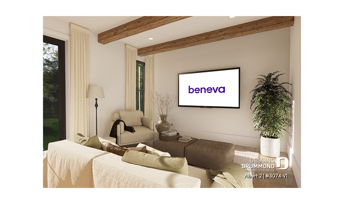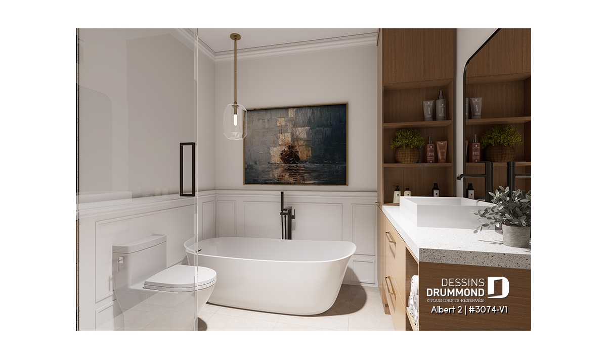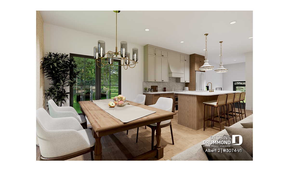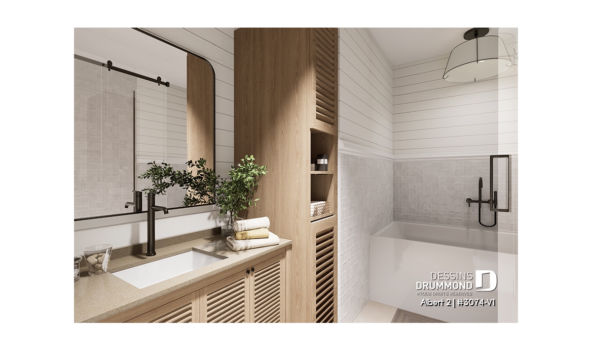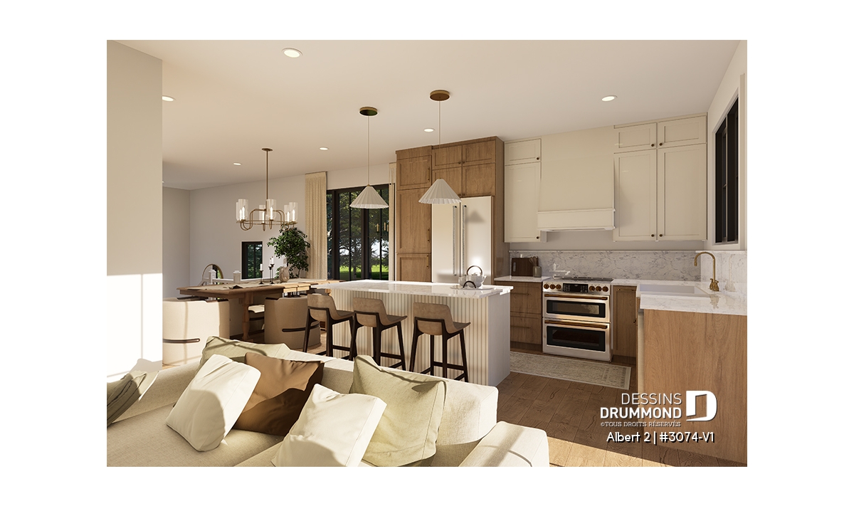 Le plan de maison ALBERT 2 (plan de jumelée #3074-V1) propose un total de 3600 pi.ca. aménagés au rez-de-chaussée et au sous-sol entièrement fini. Chacun des logements comporte donc 1800 pi.ca. aménagés au rez-de-chaussée et sous-sol fini. La grande différence versus son modèle d'origine (ALBERT) réside dans le garage qui a été ajouté à l'unité de droite. Le style moderne et rustique à la fois saura attirer l’œil autant à la campagne que dans les nouveaux quartiers résidentiels! À noter aussi que les deux logements proposent des plafonds à 9' de hauteur au plancher principal.