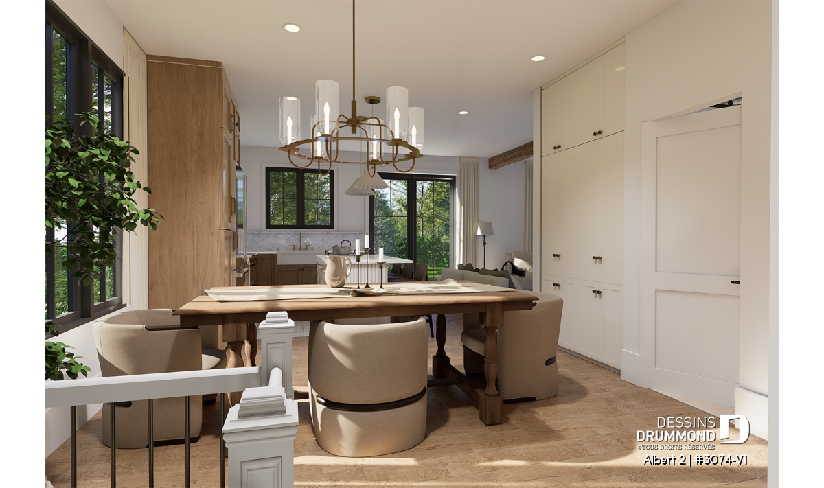 La cuisine avec îlot est ouverte sur le salon et ces deux espaces sont à l'arrière de la maison, pour le logement à gauche (1). La salle à dîner est centrale pour le logement 1, et à l'arrière de la maison pour le logement 2. Ce dernier offre un aménagement différent du rez-de-chaussée ce qui nous a permis d'ajouter un garde-manger (toujours au logement 2).