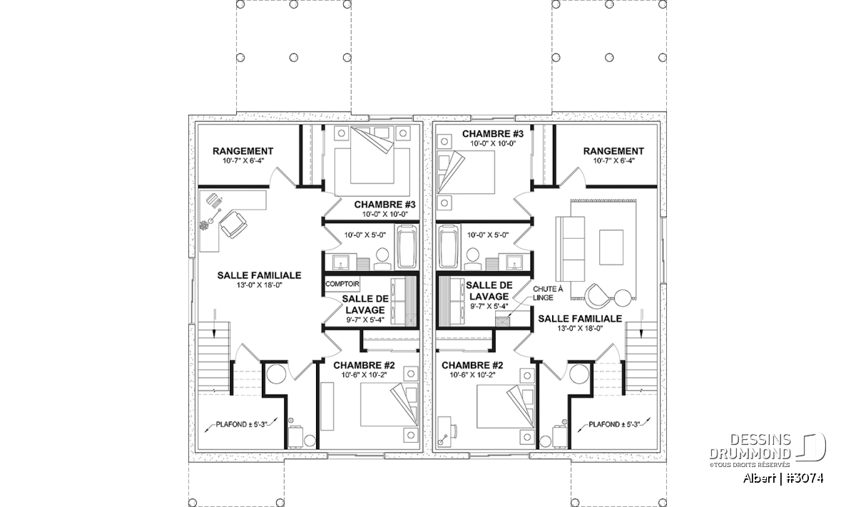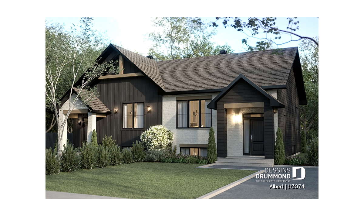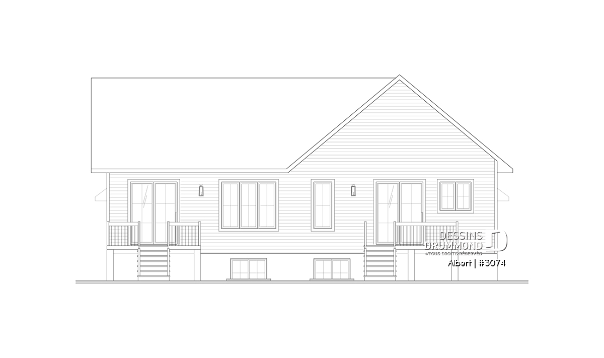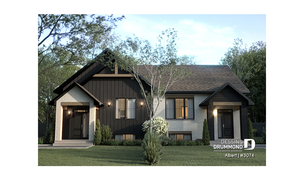 Le plan de maison ALBERT (plan de jumelée #3074) propose un total de 3600 pi.ca. aménagés au rez-de-chaussée et au sous-sol entièrement fini. Chacun des logements comporte donc 1800 pi.ca. aménagés au rez-de-chaussée et sous-sol fini. Le style moderne et rustique à la fois saura attirer l'oeil autant à la campagne que dans les nouveaux quartiers résidentiels! À noter aussi que les deux logements proposent des plafonds à 9' de hauteur au plancher principal.