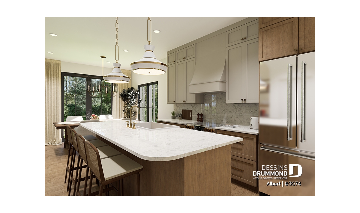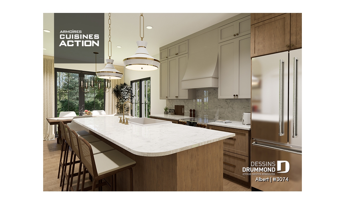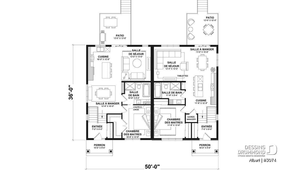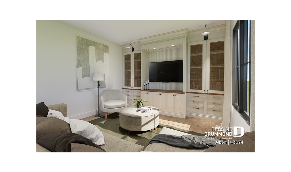 Le plan de maison ALBERT (plan de jumelée #3074) propose un total de 3600 pi.ca. aménagés au rez-de-chaussée et au sous-sol entièrement fini. Chacun des logements comporte donc 1800 pi.ca. aménagés au rez-de-chaussée et sous-sol fini. Le style moderne et rustique à la fois saura attirer l'oeil autant à la campagne que dans les nouveaux quartiers résidentiels! À noter aussi que les deux logements proposent des plafonds à 9' de hauteur au plancher principal.