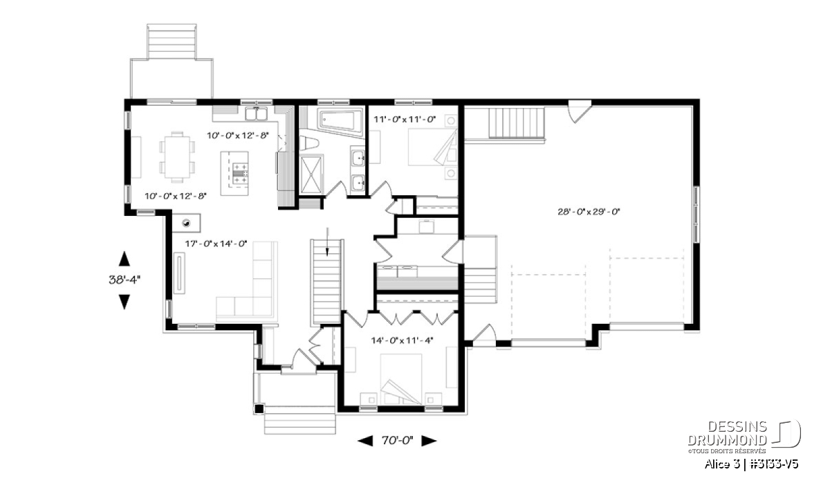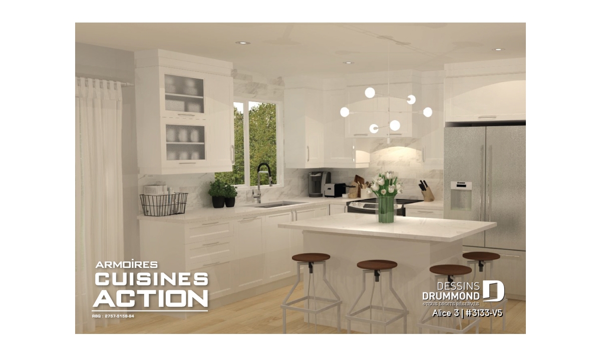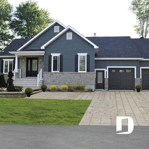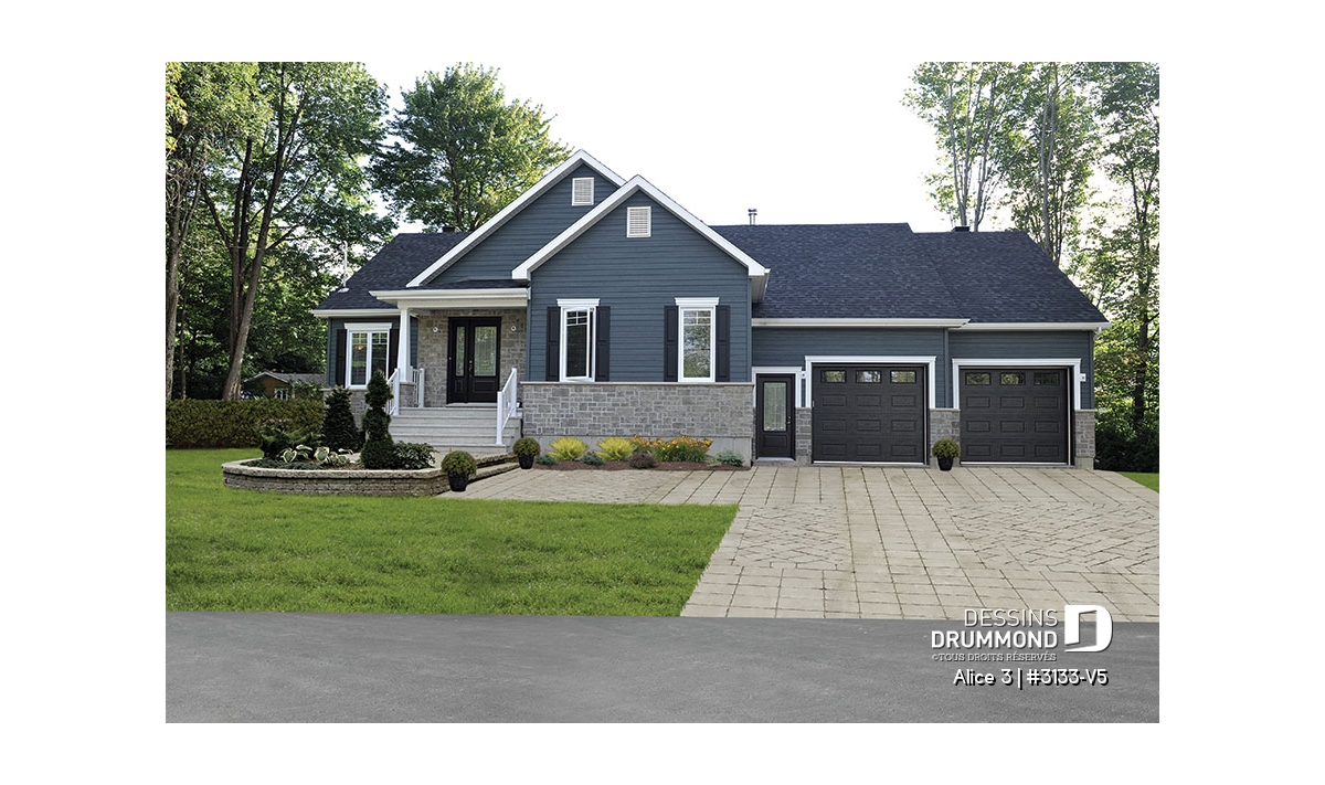 Conçu à partir du plan 3133, ce modèle version avec garage double s’adresse plus particulièrement à une clientèle avisée ou plus âgée dont le besoin de vivre sur un même plancher prend le dessus sur le nombre de chambres voire même sur le coût de construction. Voilà pourquoi, à l’intérieur, les trois chambres prévues au plan d’origine font place à un aménagement de deux chambres alors que la troisième chambre est ici convertie en véritable buanderie ou salle utilitaire dans laquelle un large comptoir avec cuve intégrée et un espace congélateur seront grandement appréciés. Bien entendu, cette approche « boomer » se caractérise aussi par l’addition d’un garage double de très beau format avec porte de service à l’avant comme à l’arrière et escalier conduisant au sous-sol. Sans oublier, l’ajout de plus de 100 pi2 au rez-de-chaussée pour des pièces toutes plus confortables que sur le plan original ainsi qu’un secteur activités entièrement ouvert et abondamment fenêtré avec foyer en plein cœur de celui-ci. C’est aussi, une cuisine avec excellent rangement et îlot-lunch et une salle de bain avec vanité double, bain d’angle confortable et douche indépendante de 3pi x 6pi. Propriétaires avisés, à vous de jouer !