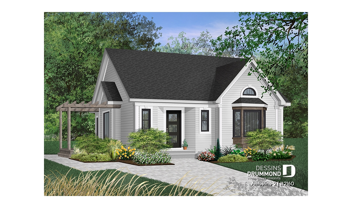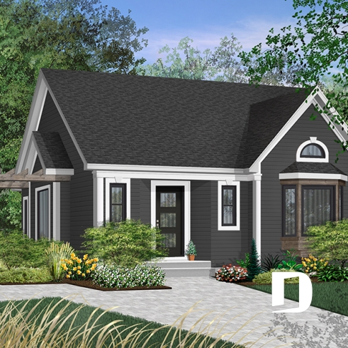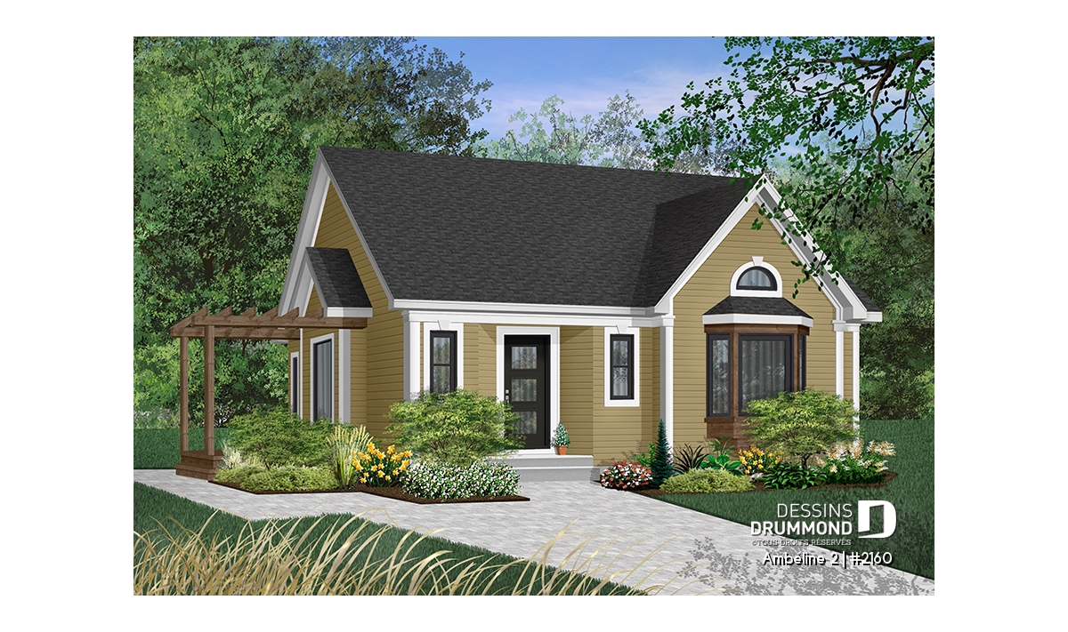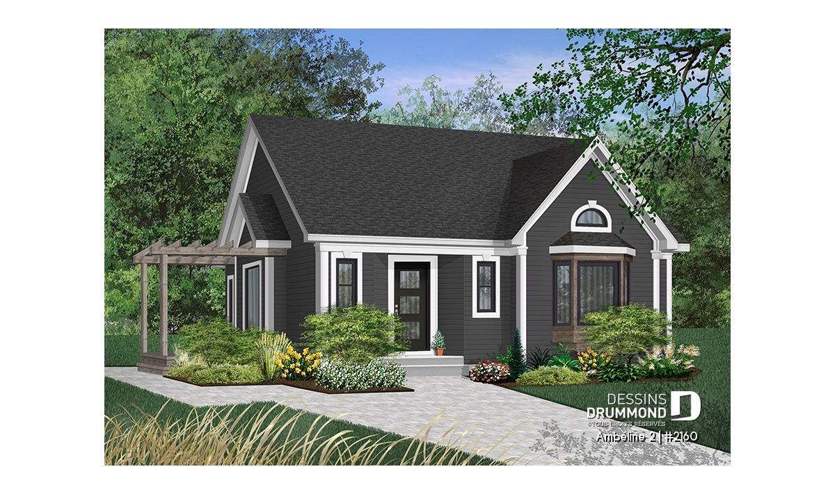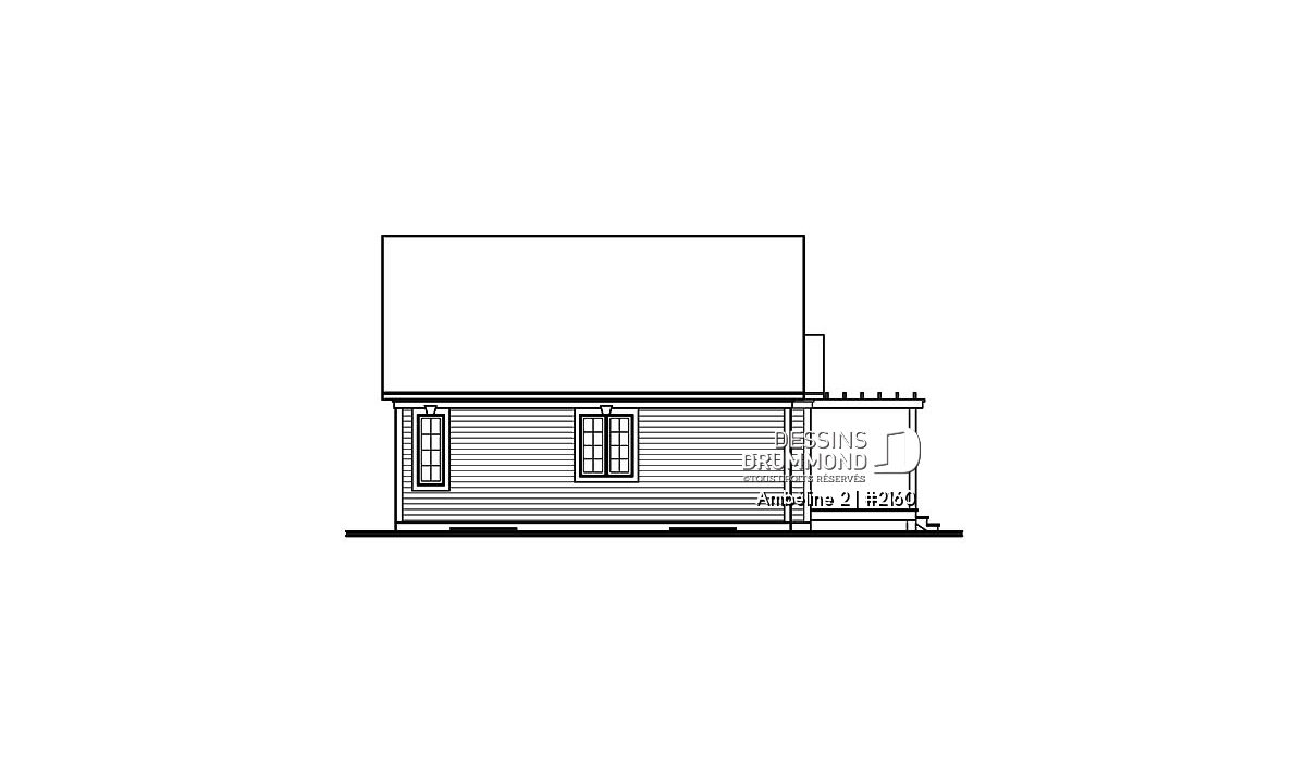 Version couleur no. 6 - Vue avant - Plan de maison plain-pied avec 2 grandes chambres à l'arrière, plafond cathédrale à la cuisine / salon - Ambéline 2