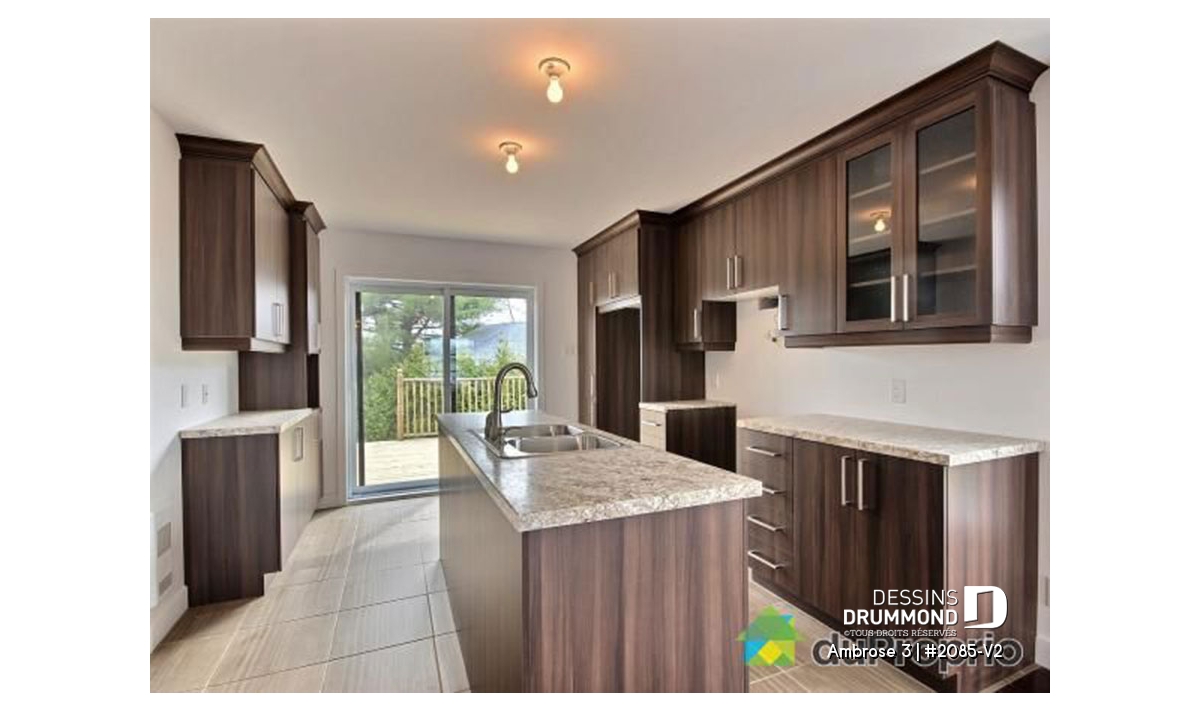 Alors que l’extérieur nous accroche l’œil avec ses portes et fenêtres de teinte foncée jumelées à un parement horizontal de simili-bois et un bloc architectural de teinte pâle, l’intérieur se veut lui aussi contemporain dans son approche et par le biais de secteurs activités ( cuisine/dînette, salle à manger et salle de séjour ) entièrement ouverts avec îlot-lunch aux cuisines et escalier aménagé en ligne droite, sans marches d’angle, vers le sous-sol. Notons d’ailleurs l’aménagement de deux salles de bain avec douche indépendante et accès de la chambre des maîtres ainsi qu’une option avec coin buanderie intégré pour ceux qui préfèrent leur coin laveuse/sécheuse au rez-de-chaussée.
