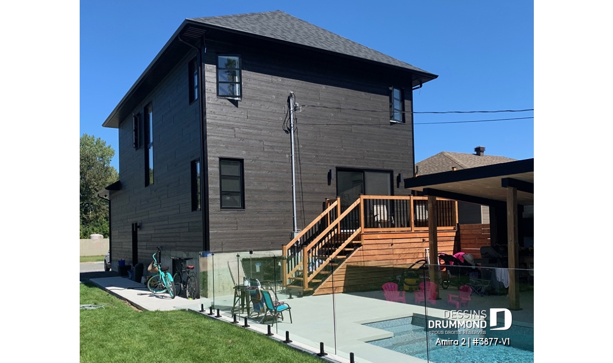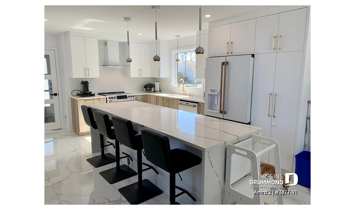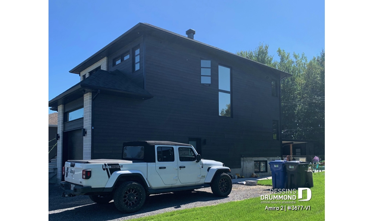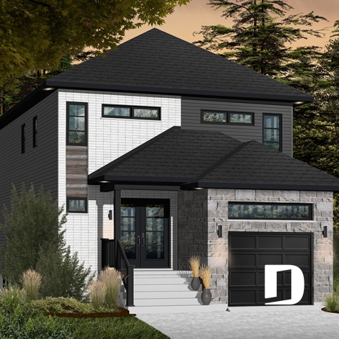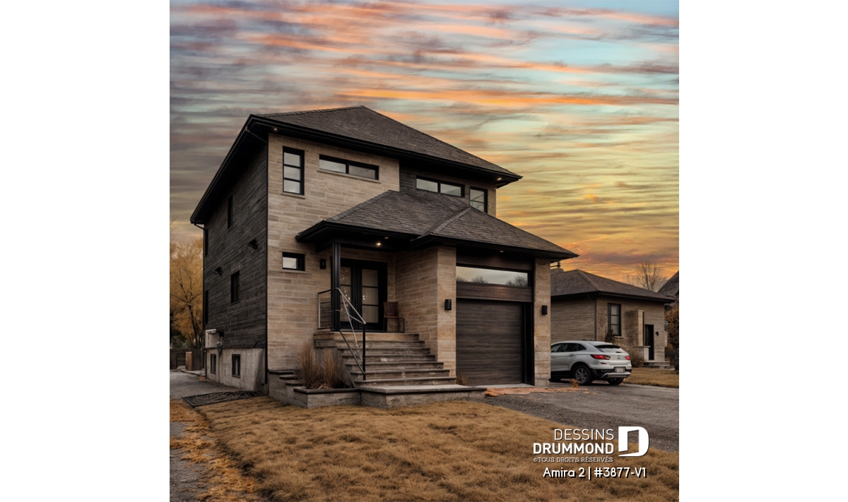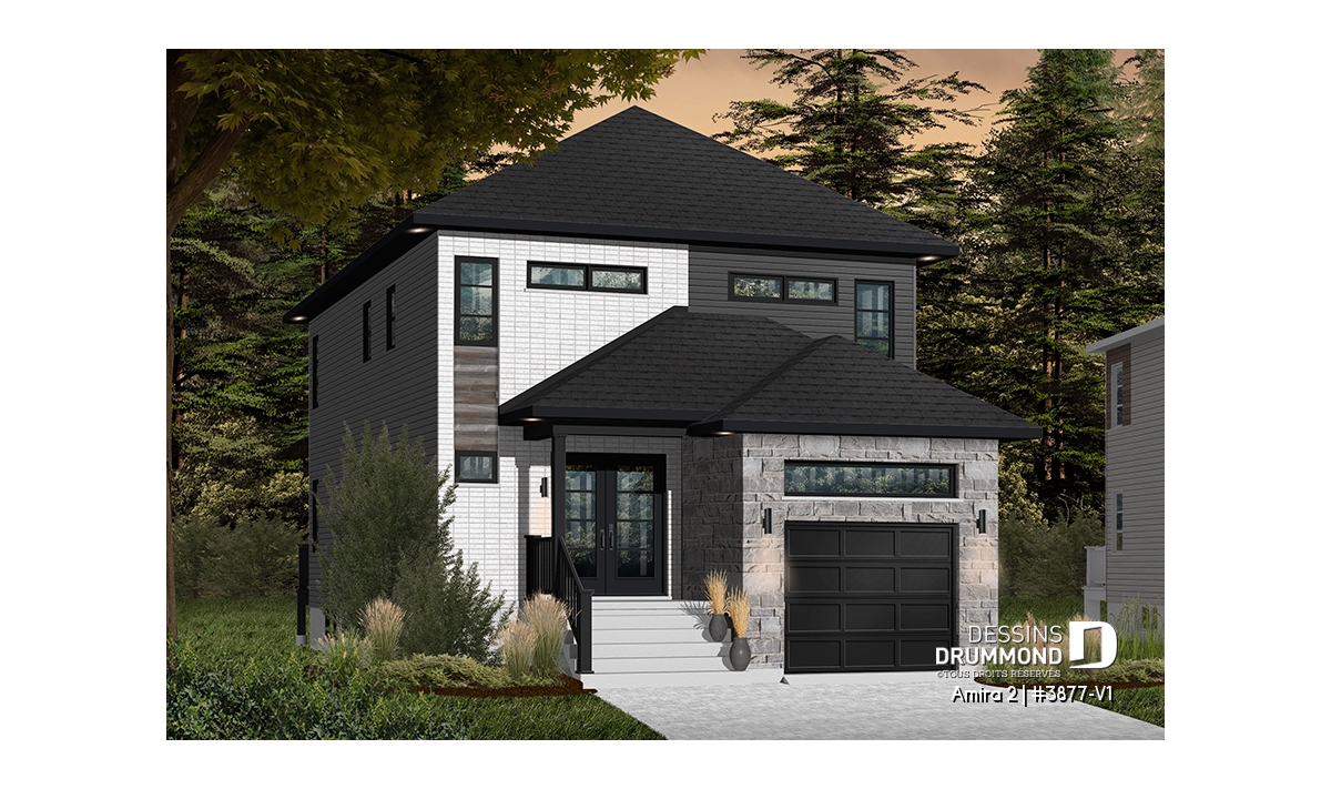 Conçu dans la foulée de modèles dédiés aux détenteurs de terrain passablement étroits tout comme les plans 3877, 3876 et 3876-V1, ce cottage de style contemporain, avec garage intégré, devient fort attrayant avec ses 25’ de largeur permettant de le construire sur un terrain de 35’ de largeur avec fenestration sur les côtés. Examinons son intérieur pour mieux l’apprécier.