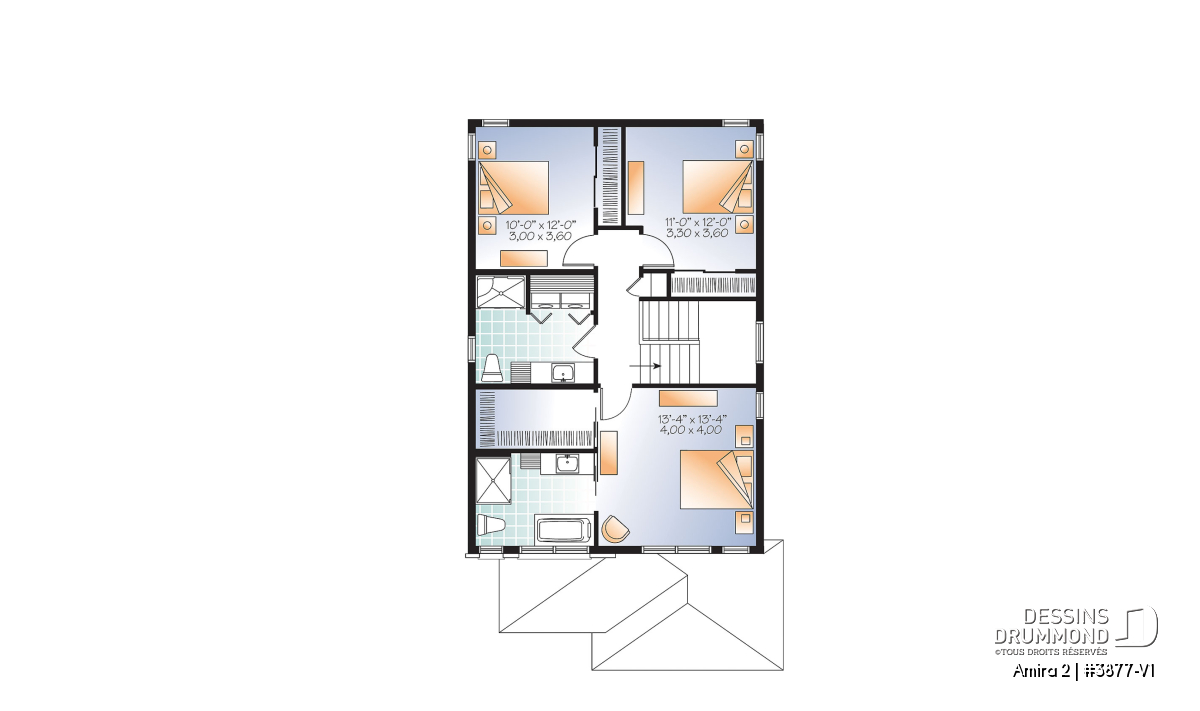 À l’étage, le 25’ de largeur ne fait nullement défaut avec le constat de trois belles chambres logeant chacune un lit double ou grand lit ainsi qu’une salle de douche jumelée au coin buanderie et en guise de salle de bain secondaire. Eh oui, ce plan suggère une véritable suite des maîtres avec garde-robe walk-in et salle de bain dotée d’une large vanité, d'un bain et grande douche, comme de plus en plus convoité.