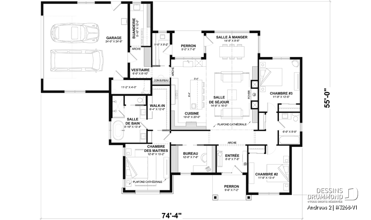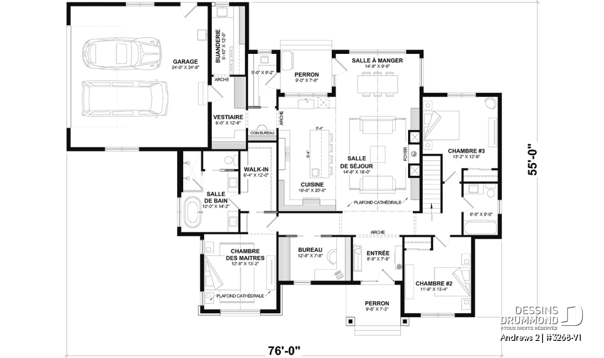 Plafond cathédrale, Garage latéral, Arche, Meuble(s) encastré(s), Aire ouverte, Garde-manger, Ilôt, Plafond à plus de 8', Tablettes, Foyer, Vue paronamique, Suite des maîtres au rdc, Chambres séparées, Walk-in ch. maîtres, Vestiaire, Salle de lavage au rez-de-chaussée, Bain et douche séparés, Lavabo double, Bureau / Salle étude, Terrasse abritée