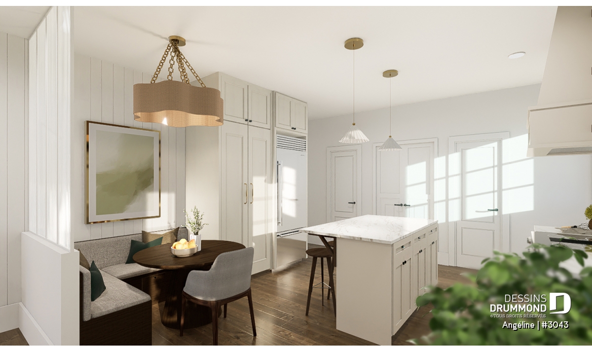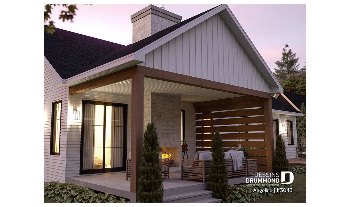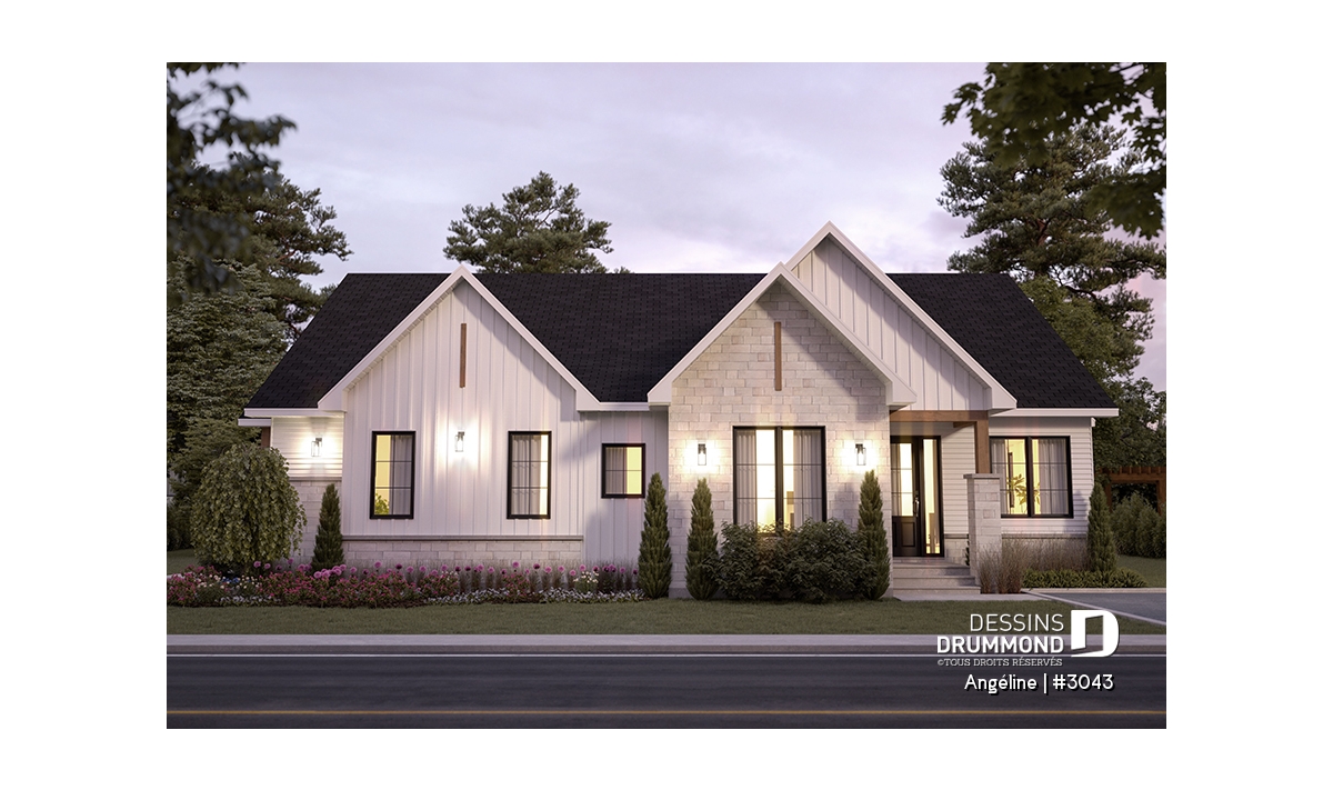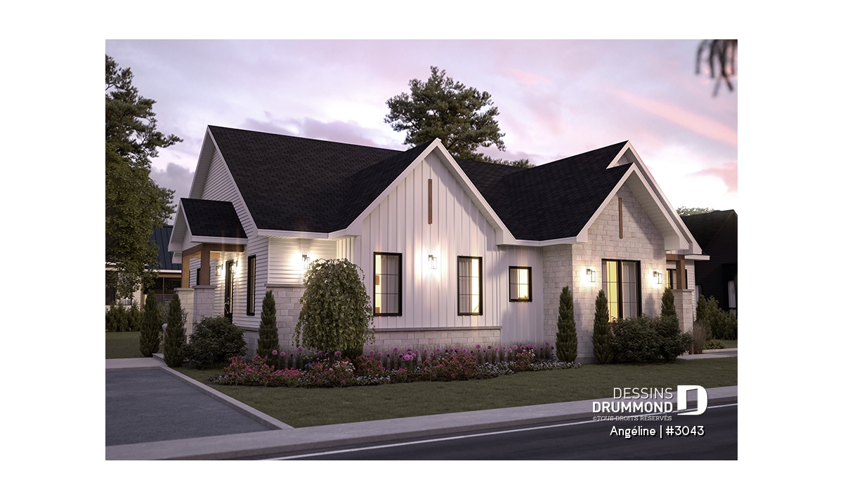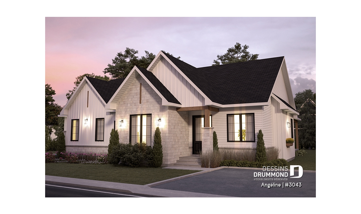 Le plan ANGÉLINE (#3043) avec son look extérieur attrayant offre des espaces de vie remarquables, notamment une suite parentale, une terrasse abritée avec foyer, un salon magnifique avec une cheminée du côté familial, ainsi qu'une cuisine avec îlot et garde-manger. Chaque modèle comprend des chambres spacieuses, une salle de lavage communicante au rez-de-chaussée et des salles de bains fonctionnelles, dont une privée à la chambre des parents au logement principal.