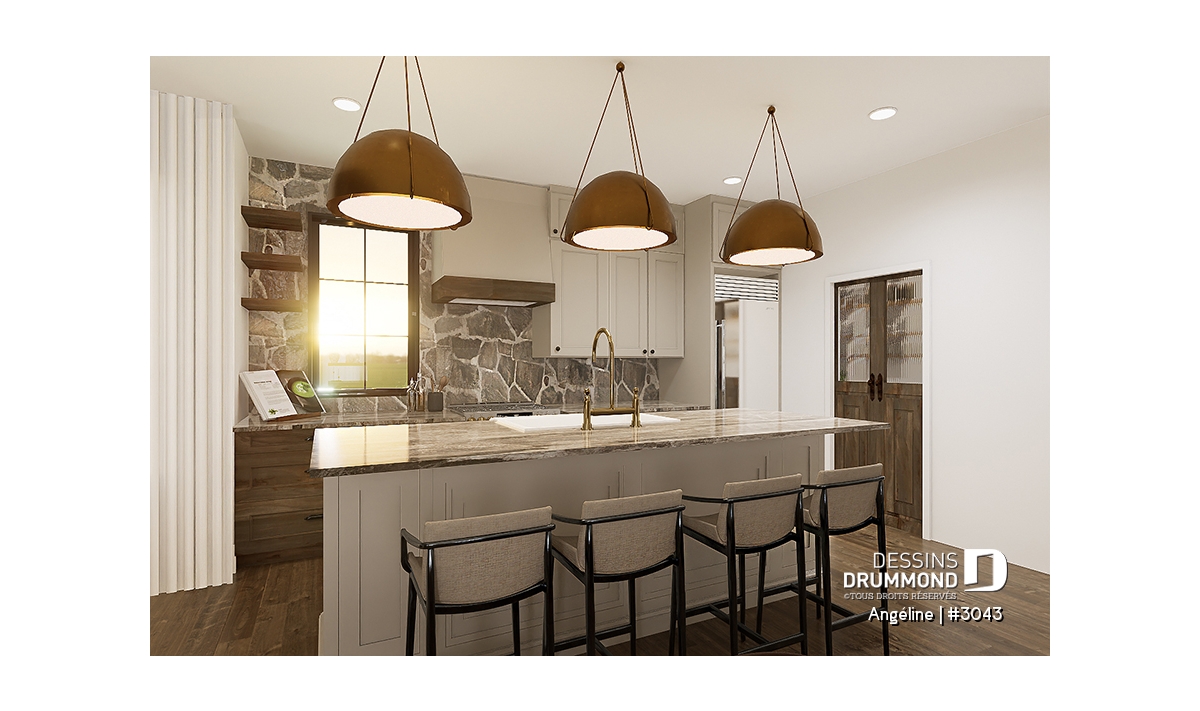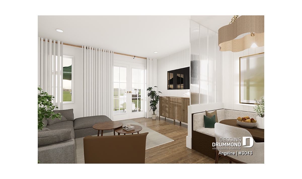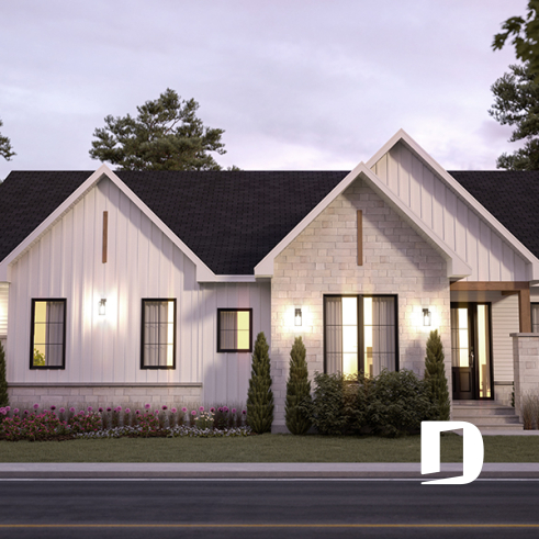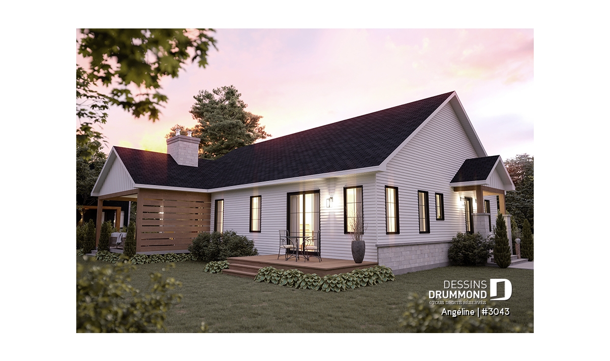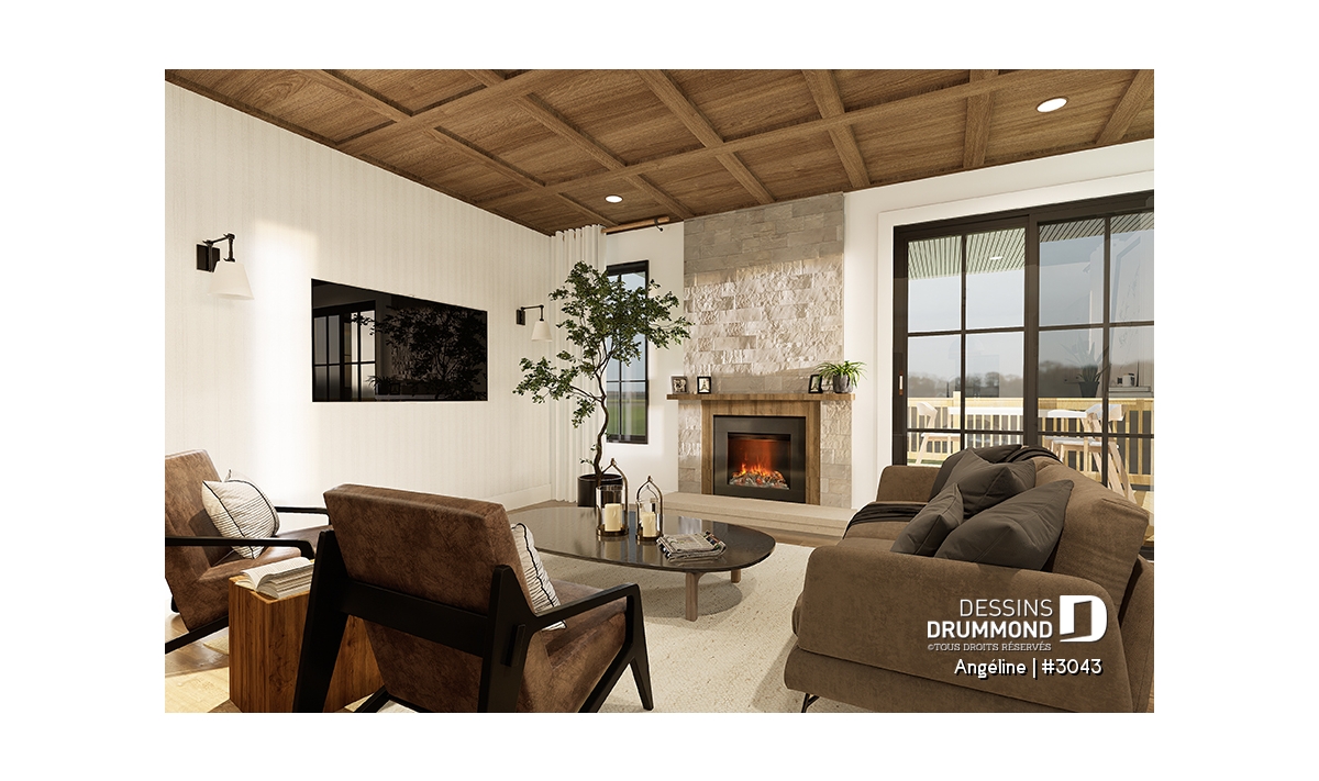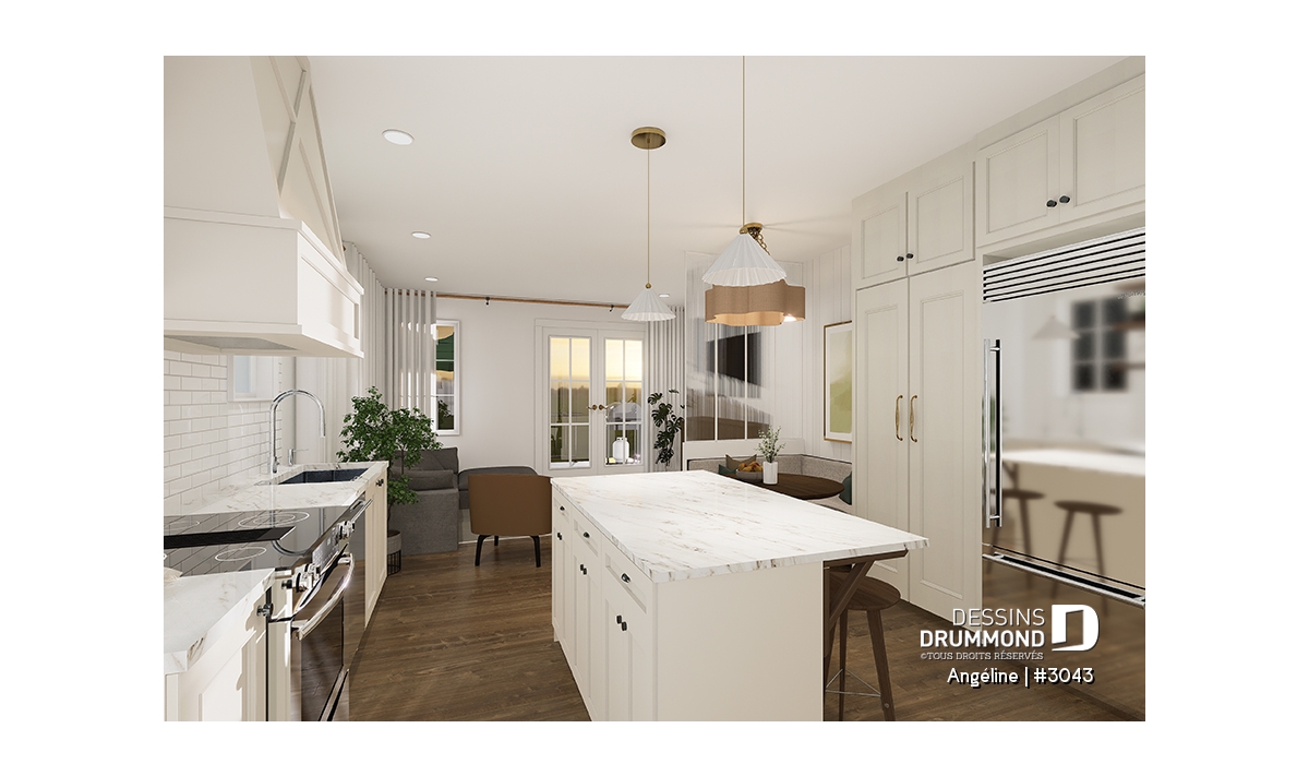 Le plan ANGÉLINE (#3043) avec son look extérieur attrayant offre des espaces de vie remarquables, notamment une suite parentale, une terrasse abritée avec foyer, un salon magnifique avec une cheminée du côté familial, ainsi qu'une cuisine avec îlot et garde-manger. Chaque modèle comprend des chambres spacieuses, une salle de lavage communicante au rez-de-chaussée et des salles de bains fonctionnelles, dont une privée à la chambre des parents au logement principal.