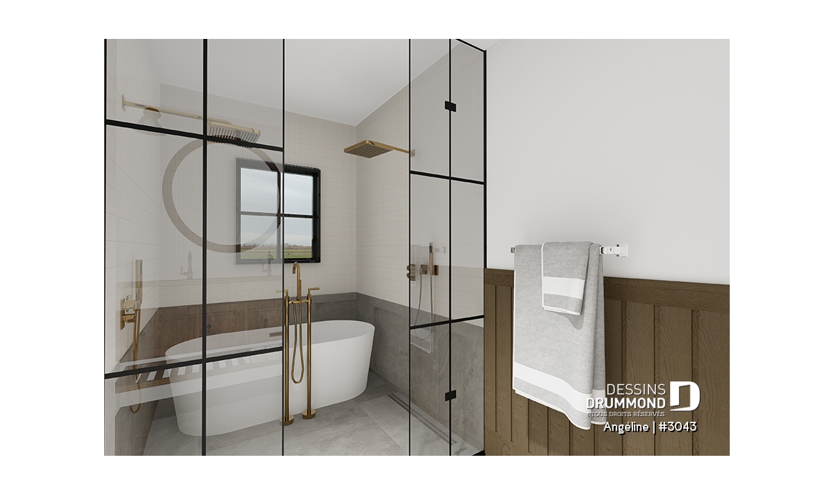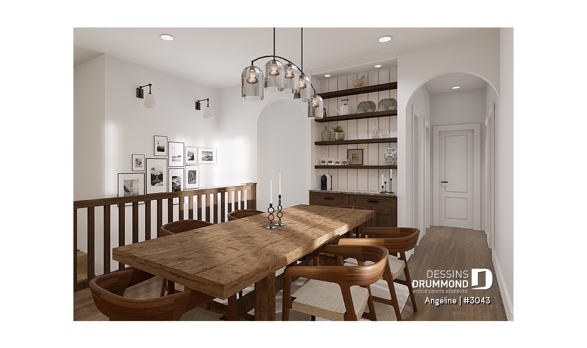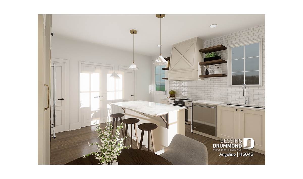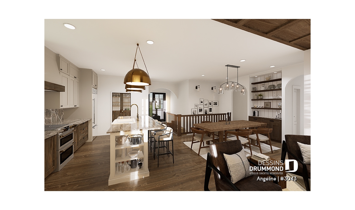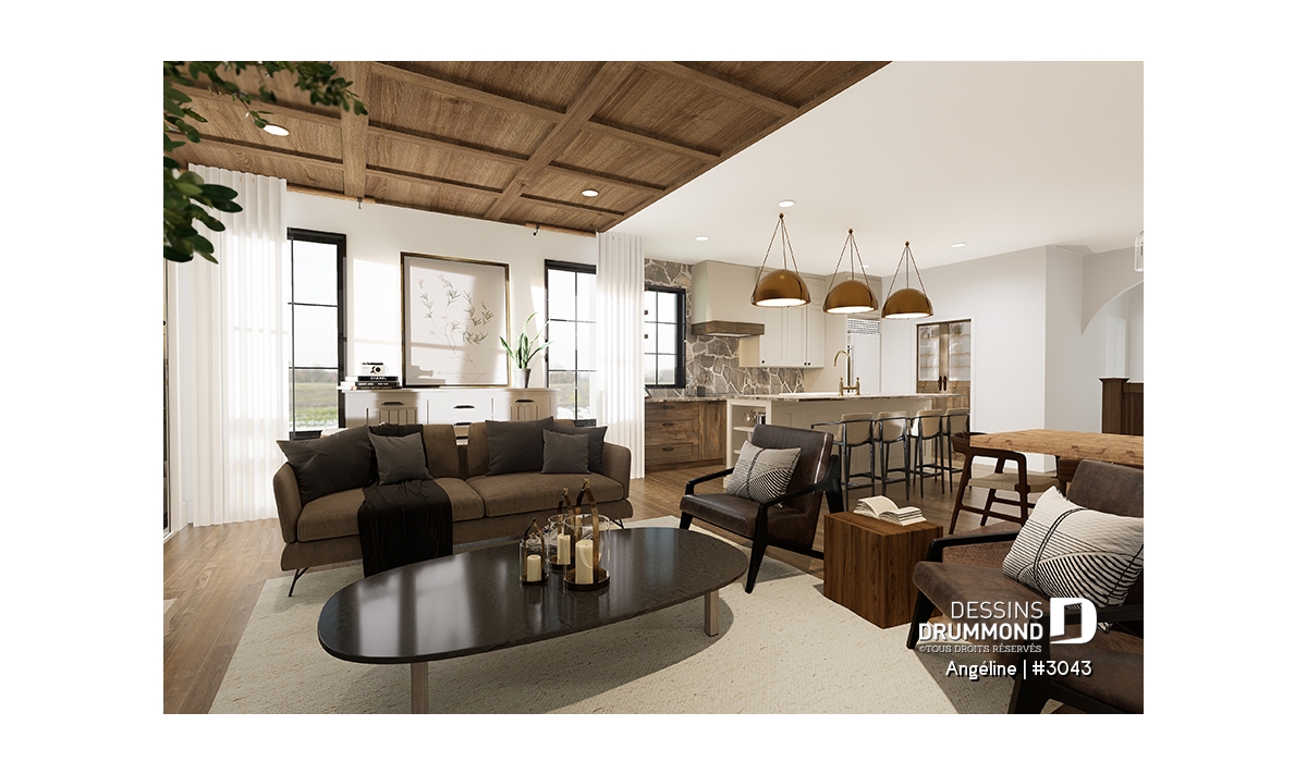 Le plan ANGÉLINE (#3043) avec son look extérieur attrayant offre des espaces de vie remarquables, notamment une suite parentale, une terrasse abritée avec foyer, un salon magnifique avec une cheminée du côté familial, ainsi qu'une cuisine avec îlot et garde-manger. Chaque modèle comprend des chambres spacieuses, une salle de lavage communicante au rez-de-chaussée et des salles de bains fonctionnelles, dont une privée à la chambre des parents au logement principal.