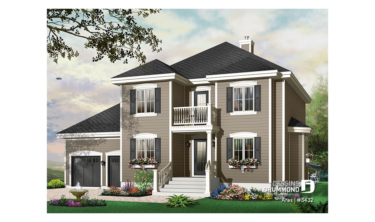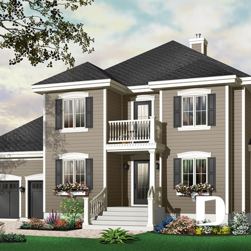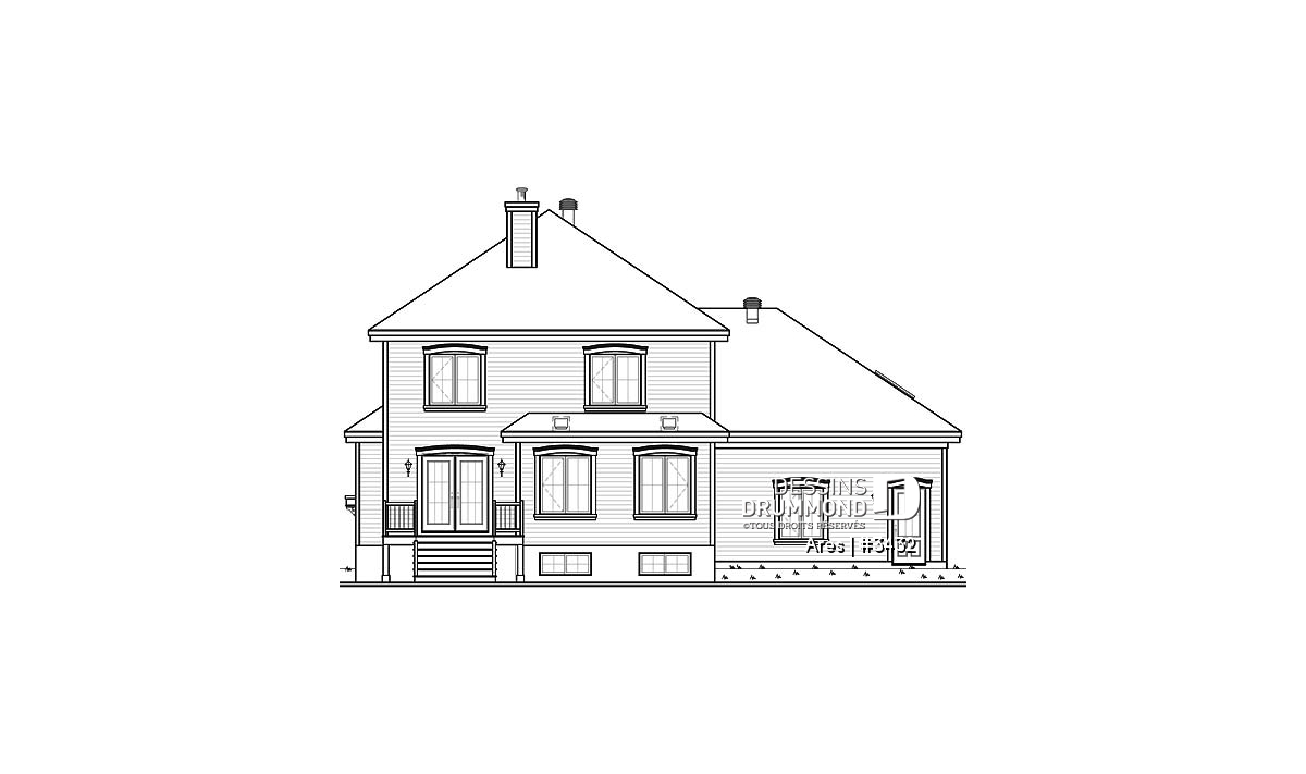 À l’intérieur, on peut apprécier, au rez-de-chaussée, un espace bureau donnant sur l’avant ainsi qu’une cuisine originale, modelée dans un volume en baie latéral, proposant un îlot central, de l’excellent rangement et un espace dînette avec table donnant aussi sur l’avant. À l’arrière, une grande salle de séjour partage un foyer avec la salle à manger. Ici, un espace buanderie est prévu au palier en provenance du garage. À l’étage, deux chambres secondaires de très beau format se partagent une salle de bain alors que la suite chambre des maîtres, aussi d’excellent format, suggère deux portes à la fois vitrées et givrées à l’entrée, une belle garde-robe de type walk-in et une salle de bain avec douche et toilette en cabine tout à fait dans l’esprit américain. Sans oublier, pour les maîtres, cet accès à un balcon à partir de leur chambre et situé en façade principale.