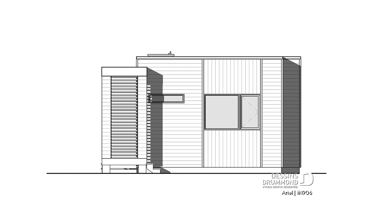 Ariel est une micro maison à bon prix et de format efficace, offrant un plafond à 9' partout, et des espaces versatiles pour les imprévus. Elle s’intègre bien au mode de vie des futurs propriétaires en milieu urbain. D’un point de vue pratique, l’accès à la maison s’effectue par le côté et donne directement sur une garde-robe, avec coin buanderie (laveuse-sécheuse superposée).