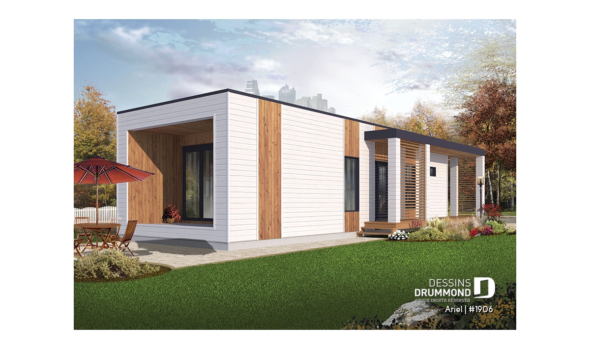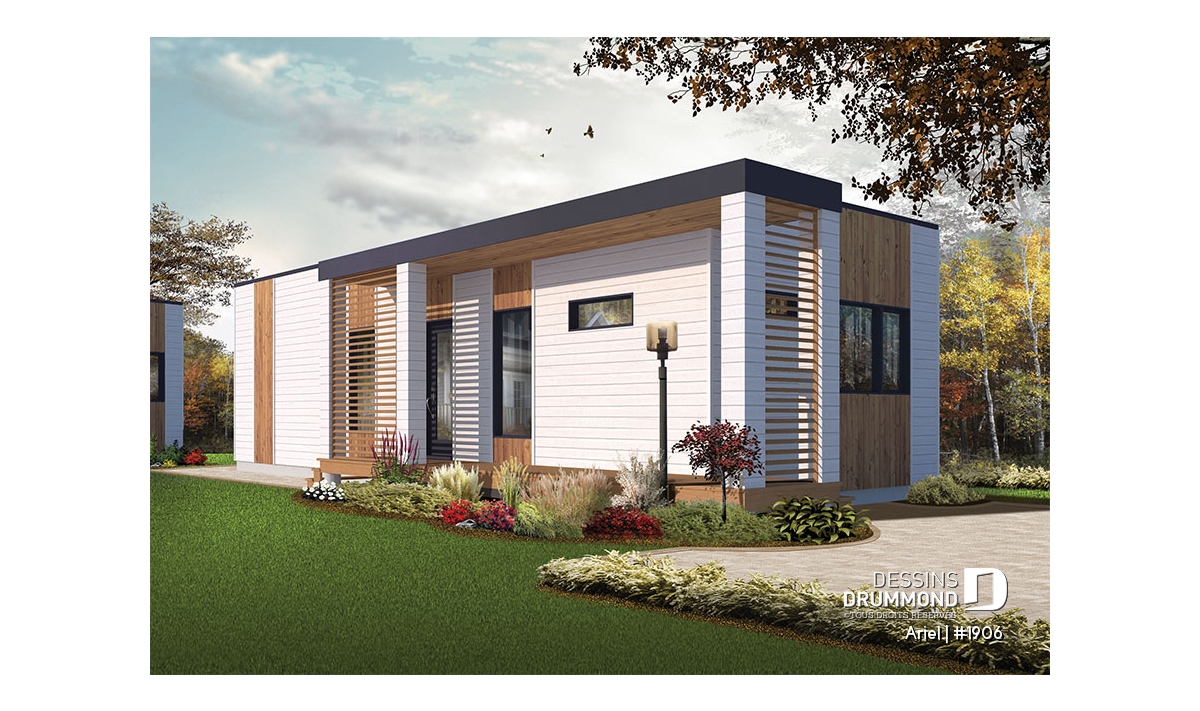 Plan de mini plain-pied moderne, 631 pi. carré, plafond 9 pieds, 2 chambres, terrain étroit, terrasse abritée