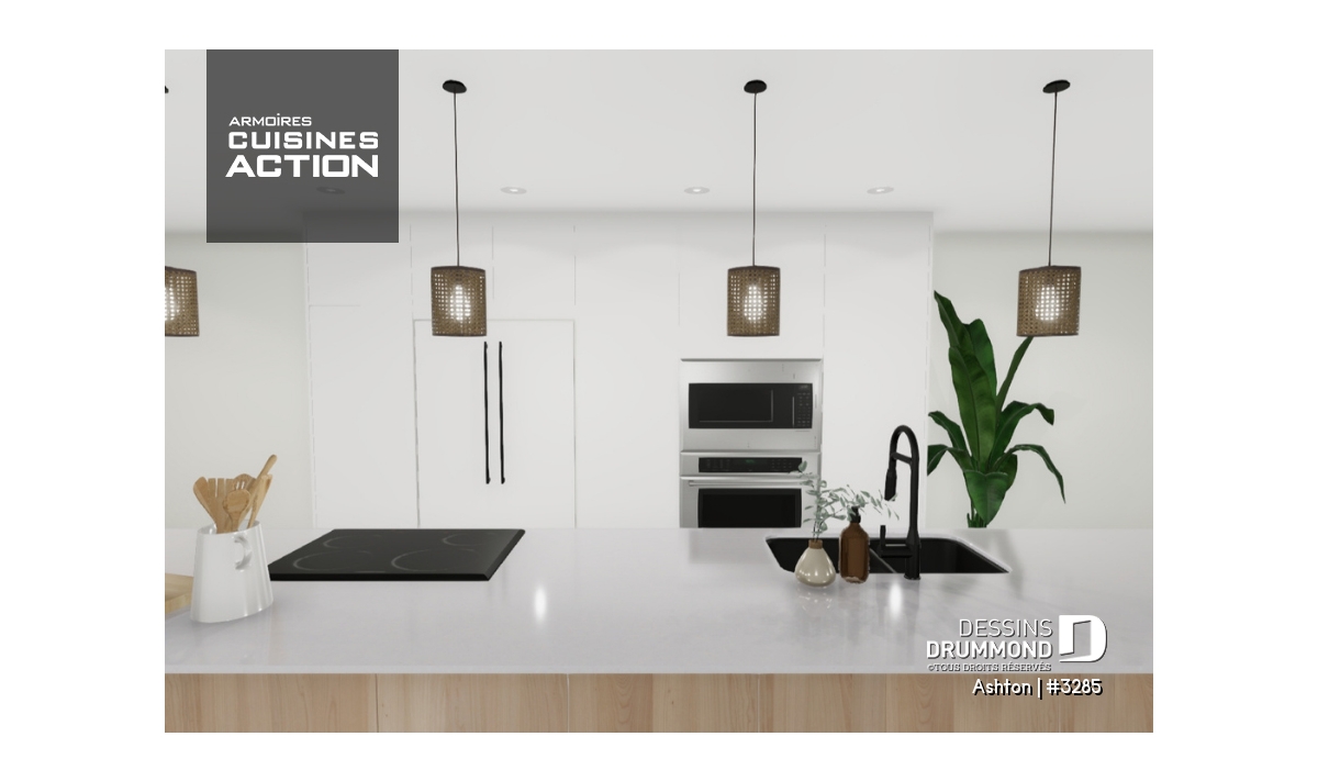 Cuisine avec grand îlot pouvant accueillir 4 à 5 invités.