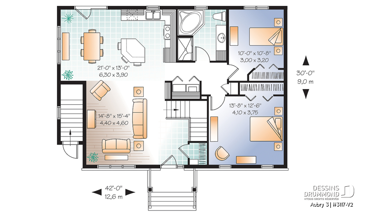 Il ne fait pas de doutes que l’on peut parler d’un plan populaire lorsque l’on parle du plan 3117. Celui-ci, tout comme le plan similaire 3107 qui propose 3 chambres, fait maintenant partie des plans favoris des québécois. Afin de faciliter davantage l’accessibilité à ce modèle déjà populaire, Dessins Drummond propose ce plan version 3117-V2 avec « bachelor » au sous-sol que plusieurs qualifieront d’encore plus attrayant.