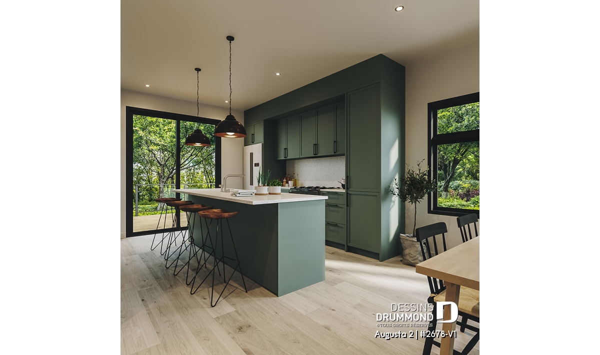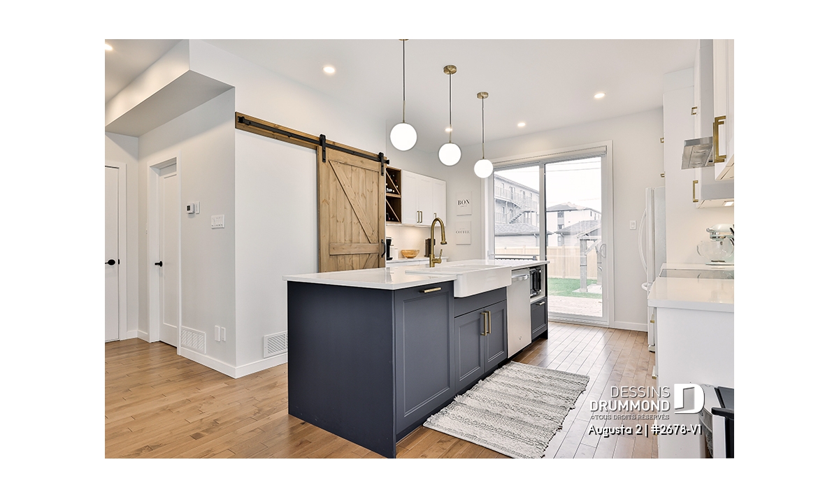 Cuisine conviviale avec îlot central et garde-manger, agrémentée d’un joli coin tablette décoratif pouvant aussi servir de bar à café.