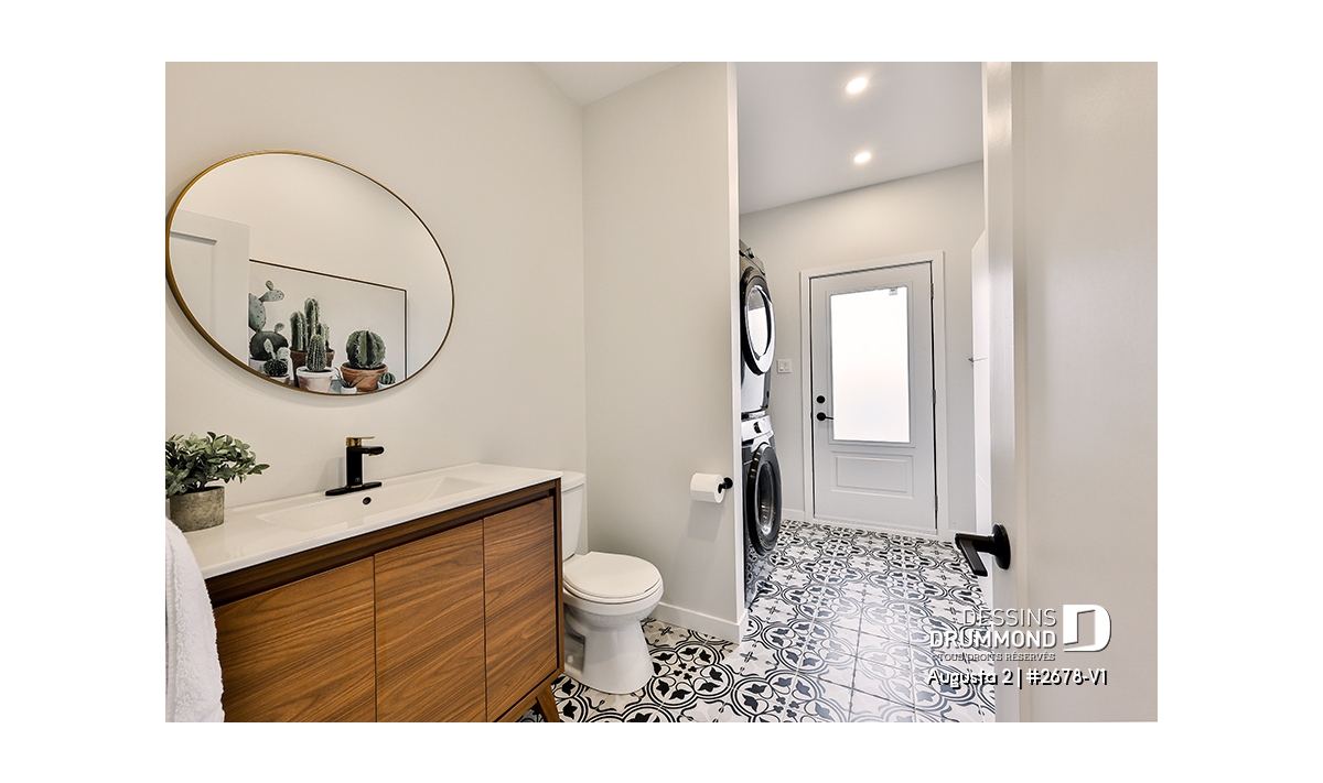 La présence d’un accès extérieur vers la salle d’eau permet de préserver la propreté des planchers après une journée à l’extérieur, tandis que la salle de lavage au rez-de-chaussée élimine les allers-retours inutiles entre les étages, rendant le quotidien plus simple et efficace.