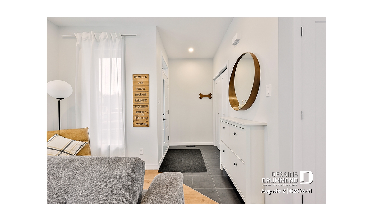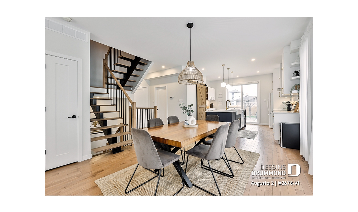 Dès l’entrée, les plafonds de 9 pieds au rez-de-chaussée apportent une agréable sensation d’espace et de luminosité. L’entrée avant, bien pensée, est dotée d’une garde-robe pratique, idéale pour organiser manteaux et accessoires au quotidien. L’aménagement a été conçu pour faciliter la vie de tous les jours, notamment grâce à l’accès direct du garage à la cuisine, un détail fort apprécié lorsqu’on revient avec les emplettes.