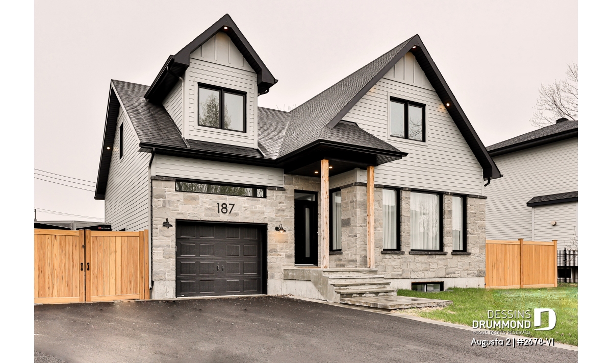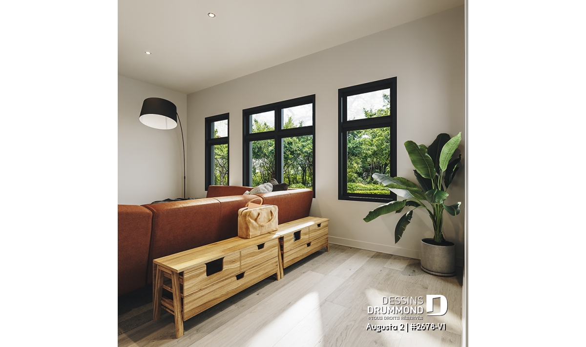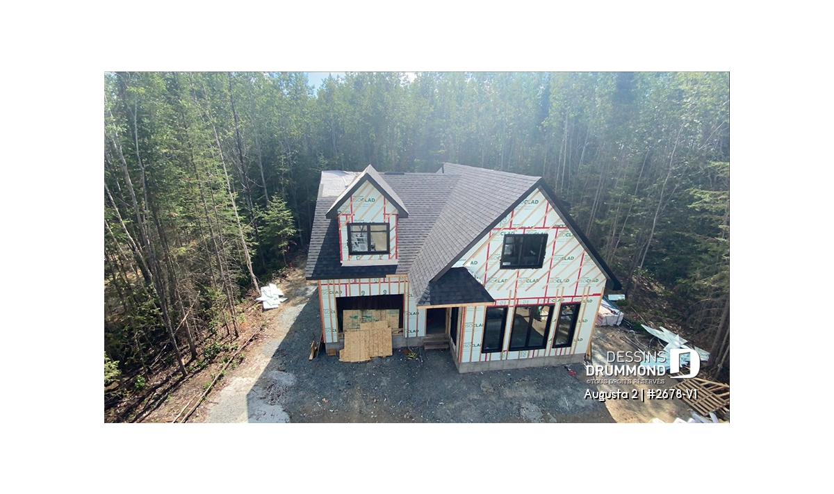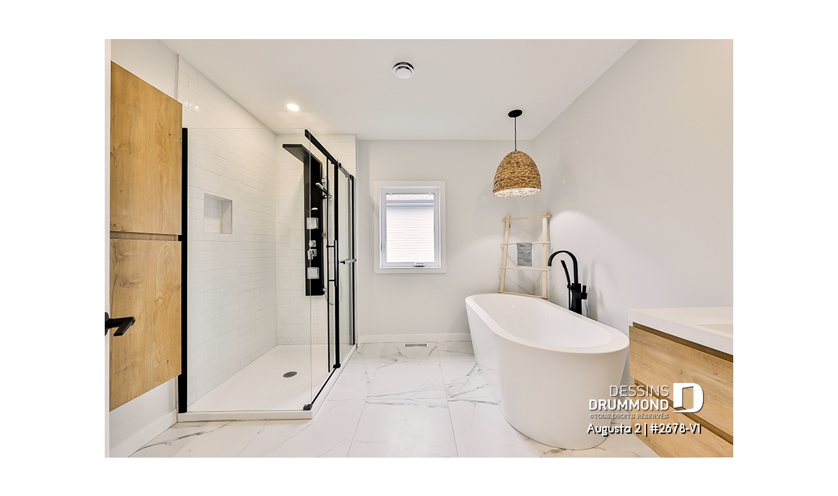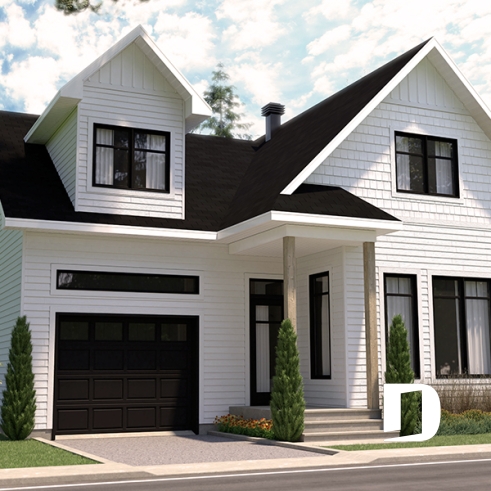 Le garage simple très profond offre une flexibilité remarquable, permettant le rangement d’une moto, d’équipements sportifs ou l’aménagement d’un petit atelier. Enfin, le sous-sol non fini, inclus au plan de base, ouvre la porte à de nombreuses possibilités d’aménagement. En option, il peut accueillir une suite d’invités avec salle de bain privée, une salle familiale ou salle de jeux avec coin bureau, ainsi que des espaces de rangement et une pièce mécanique.