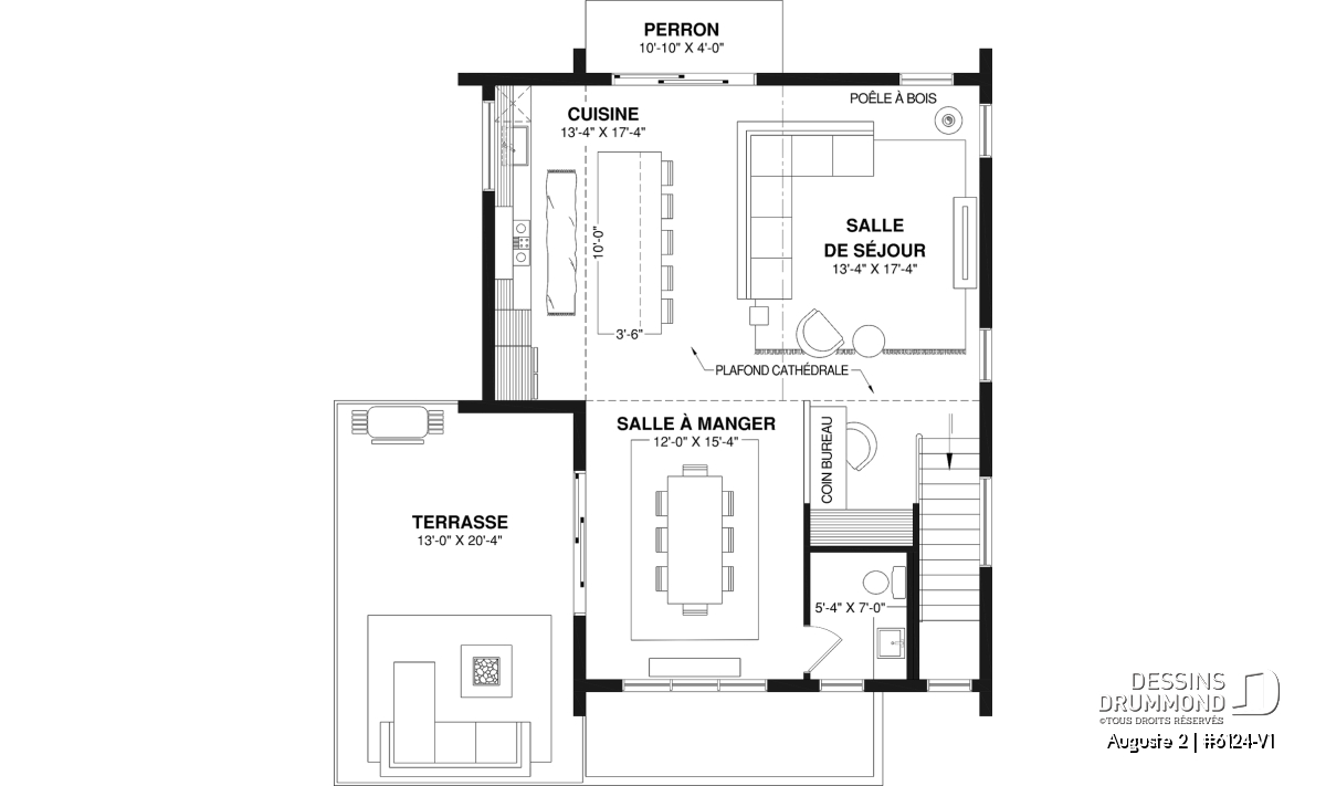 Balcon à l'étage, Planchers inversés, Plafond cathédrale, Salle de lavage au rez-de-chaussée, Plafond à plus de 8', Bain dans la douche, Banquette, Poêle à bois, Aire ouverte, Ilôt, Coin bureau