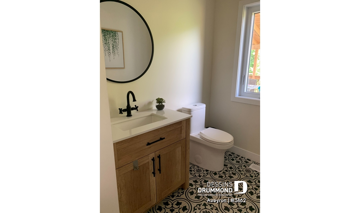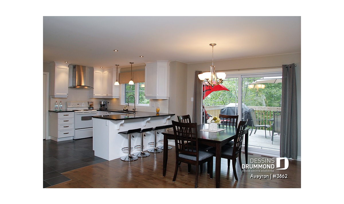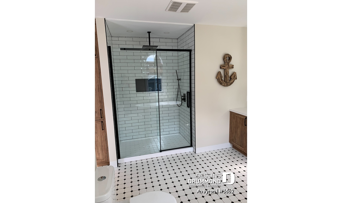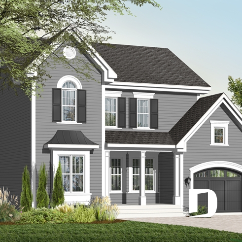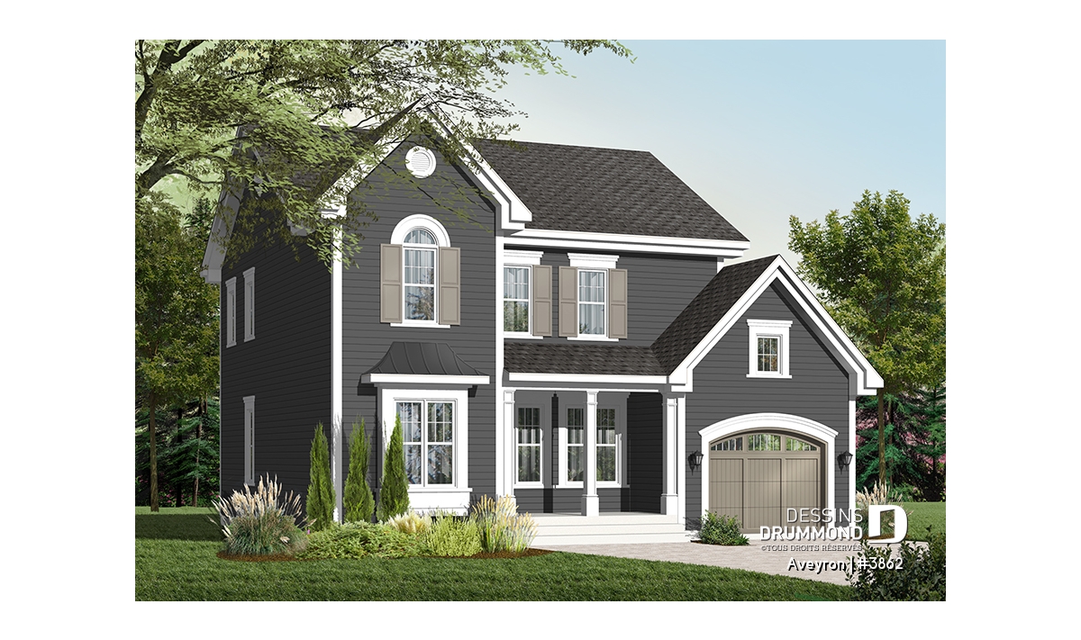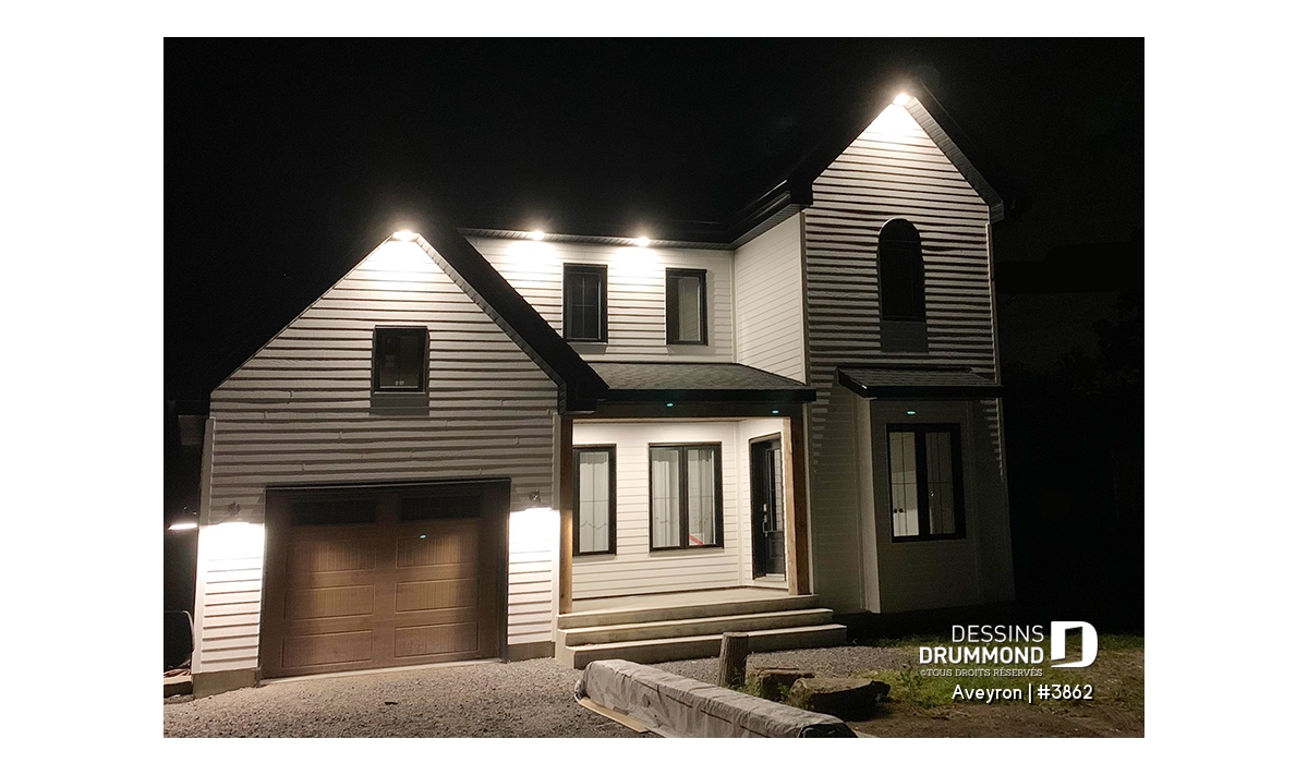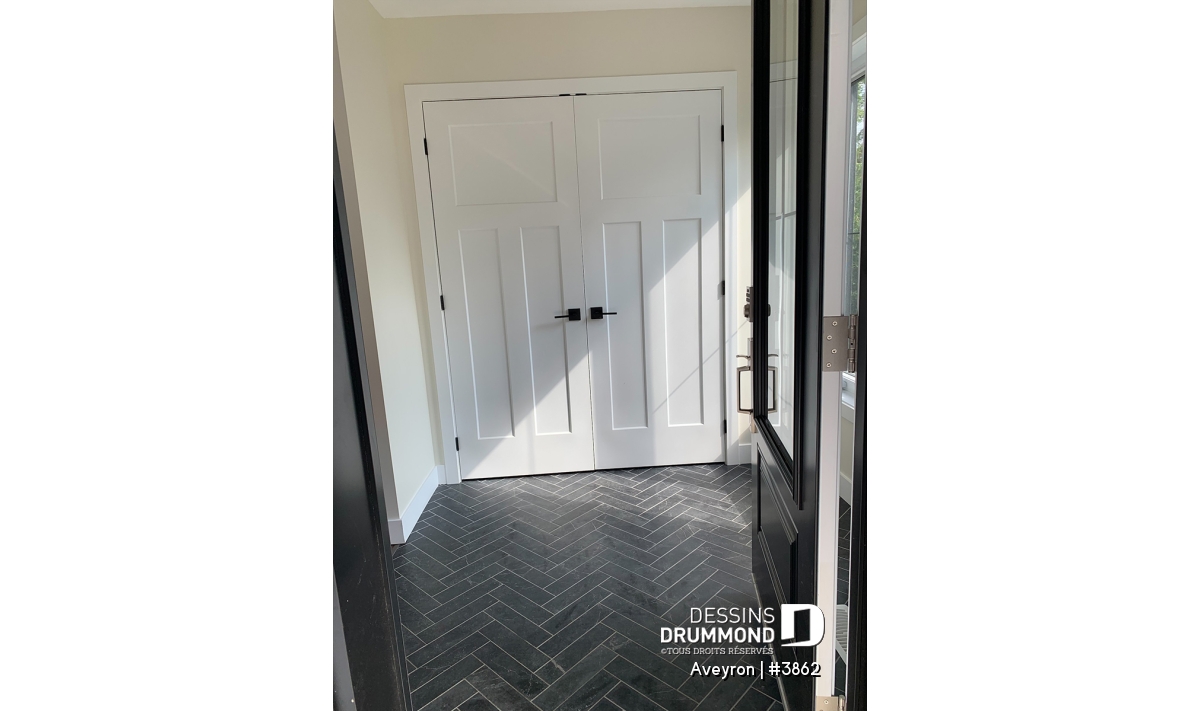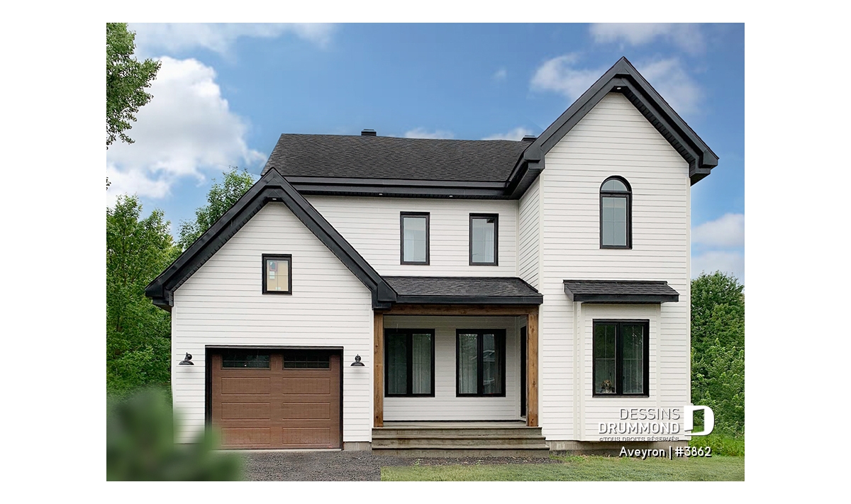 Ainsi, à l’extérieur, on retrouve un perron couvert assurant un accès plus intime à l’entrée principale agrémentée d’une entrée, genre vestibule avec fenêtre en saillie, et un garage avec porte tout à fait dans le ton de la maison. Les volumes sont à la fois simples et élégants et permettent un aménagement intérieur tout en confort. Entrons donc sans plus tarder !
