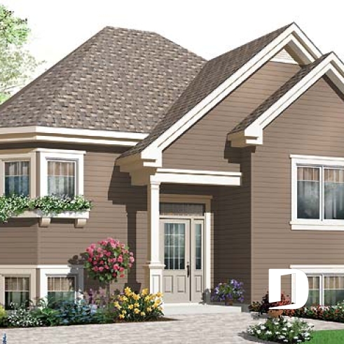 Dans la foulée de ces plans de maisons facilitant l’accès à la propriété, Dessins Drummond vous suggère ce modèle de trois chambres avec bachelor intégré et entrée à palier permettant l’obtention de fenêtres de bon format pour les pièces du sous-sol..