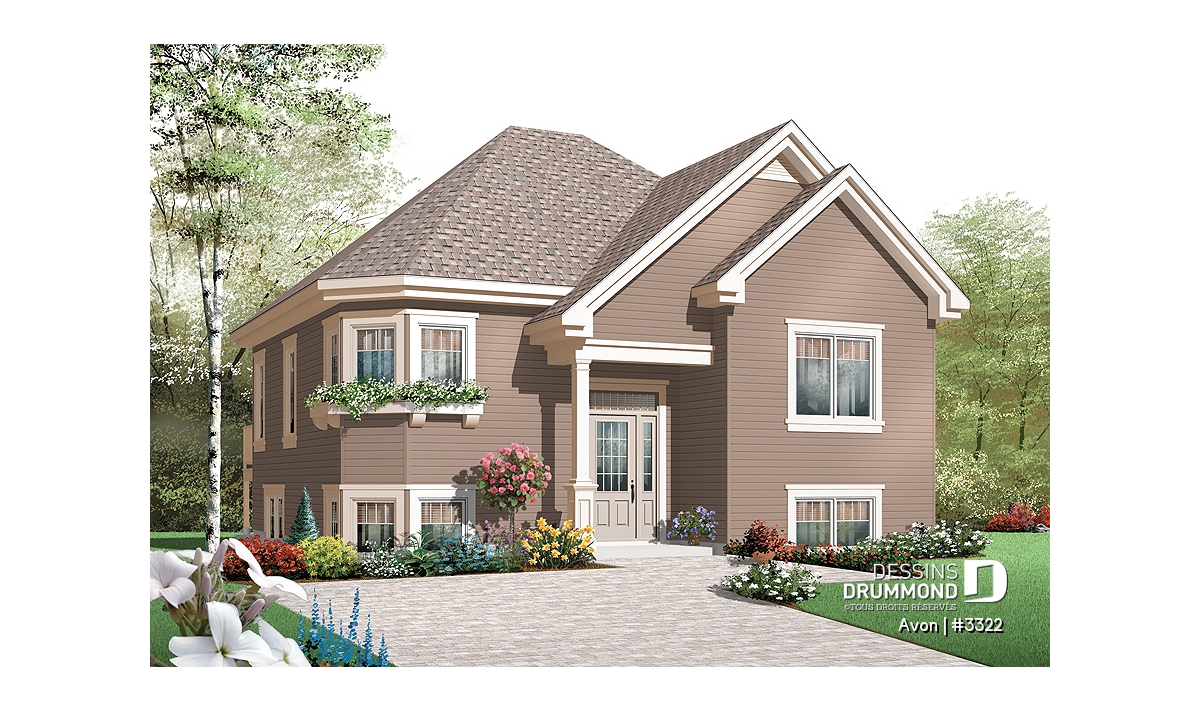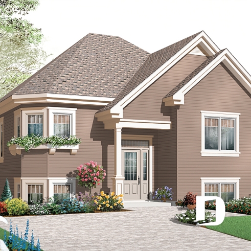 Plan de maison de type split level économique, 2 chambres, style américain, grande cuisine