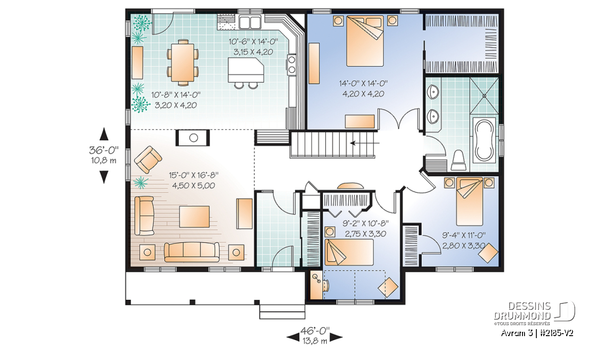 Notez aussi la disponibilité de cet autre modèle version qu’est le 2185-V1 avec des chambres secondaires un peu plus grandes en raison d’un agrandissement de 6pi en profondeur du plan 2185 d’origine.