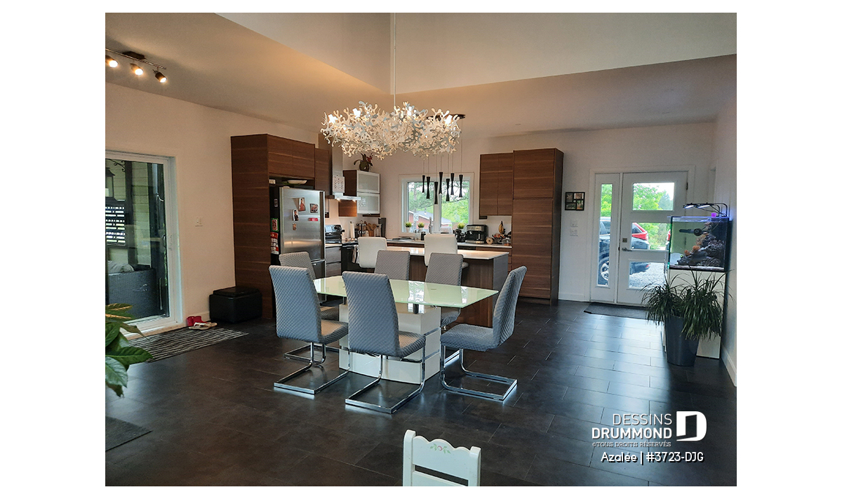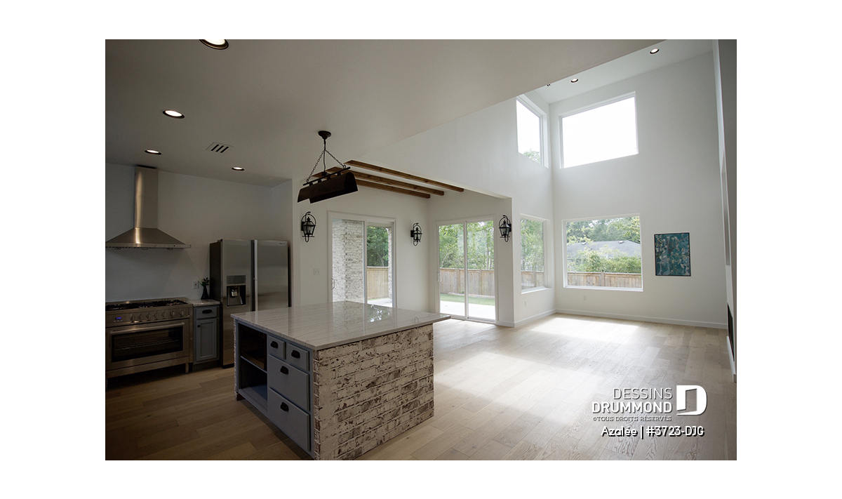 Cuisine avec grand îlot, garde-manger et à aire ouverte avec le reste des espaces communs.