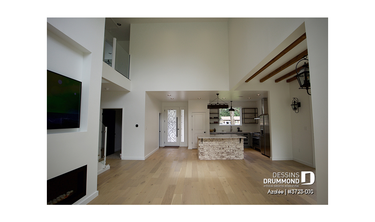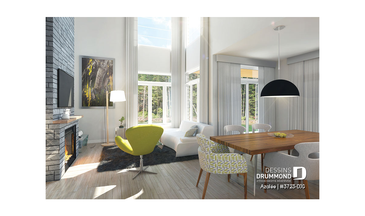 Salle de séjour avec foyer sur 2 étages et plafond cathédral.