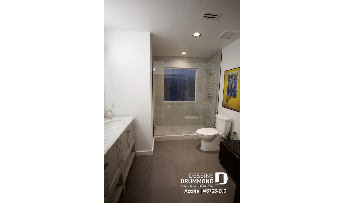 Conçu à l’origine pour une fondation de type dalle flottante avec chauffage radiant, le plan peut aussi accueillir un système central de chauffage et de climatisation, optimisé par l’énergie solaire et un thermostat intelligent, désormais accessible à coût raisonnable. L'option sous-sol aménageable est également disponible, à sélectionner dans le panier d'achat.