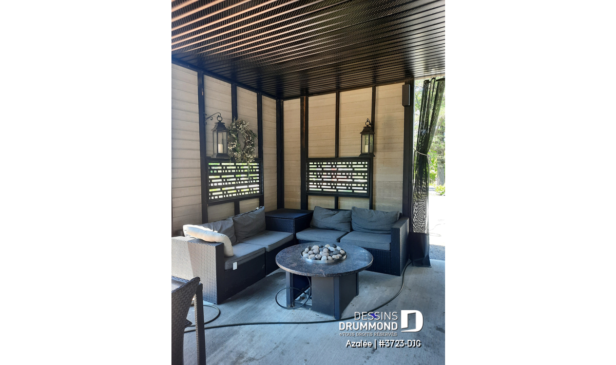 À l’extérieur, l’Azalée va encore plus loin : espace grillagé pour jardin, collecteur d’eau de pluie ou poulailler urbain, pergola pouvant accueillir vignes ou fleurs, et potager à proximité de la cuisine. La grande terrasse couverte, pensée pour le confort été comme pluie, devient un véritable prolongement de l’espace de vie.