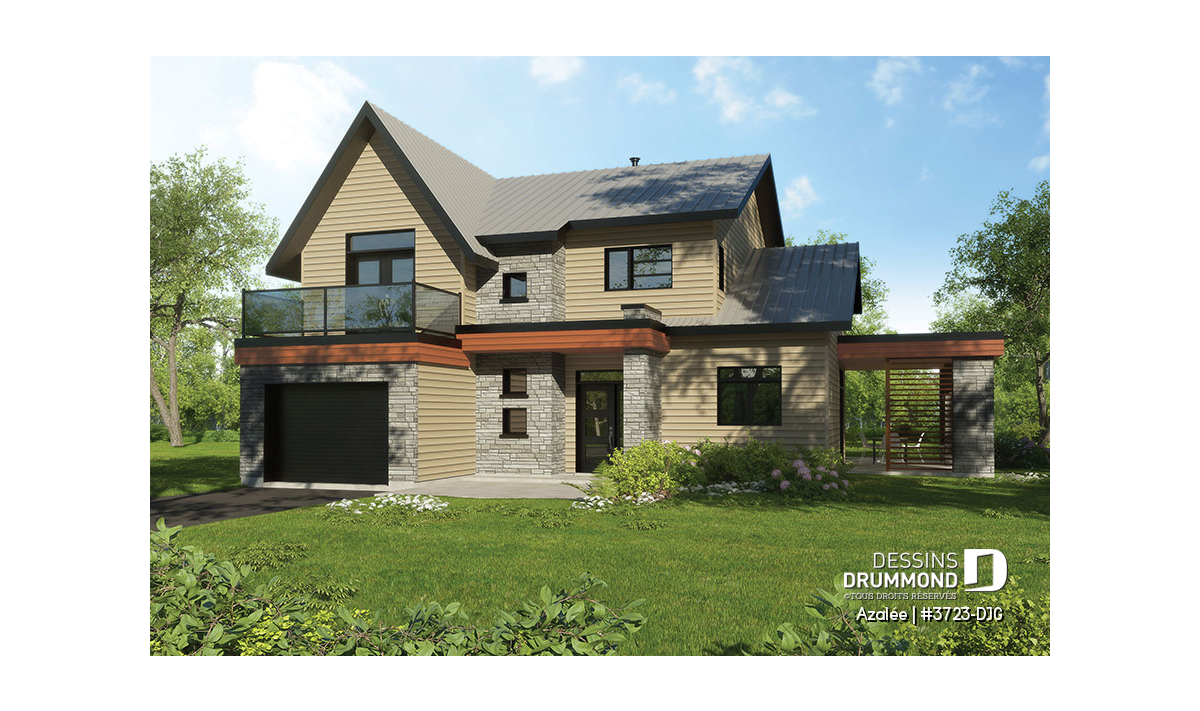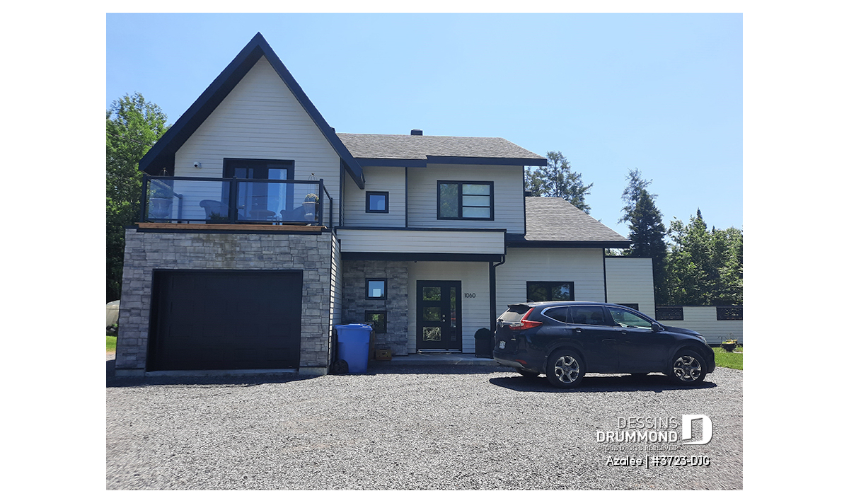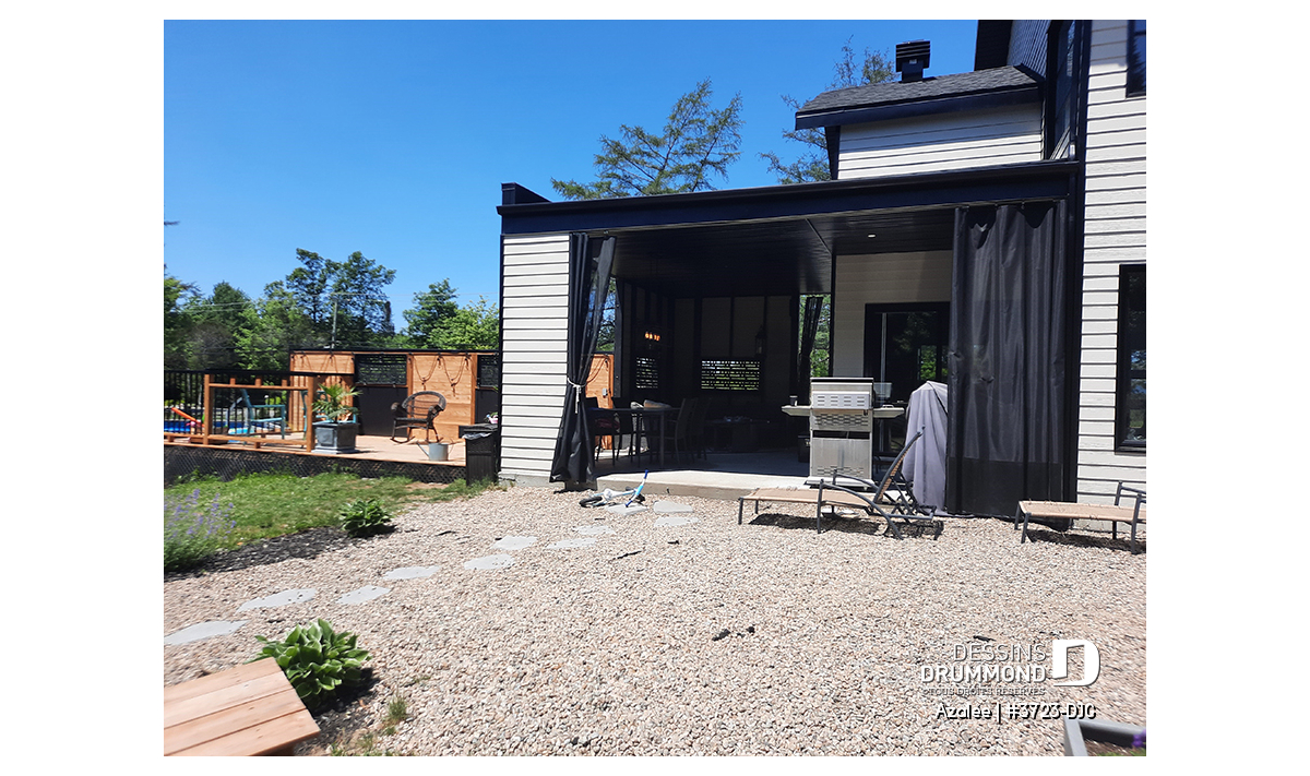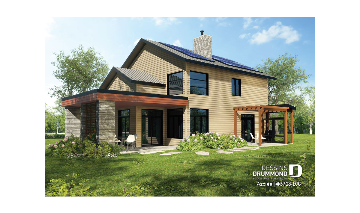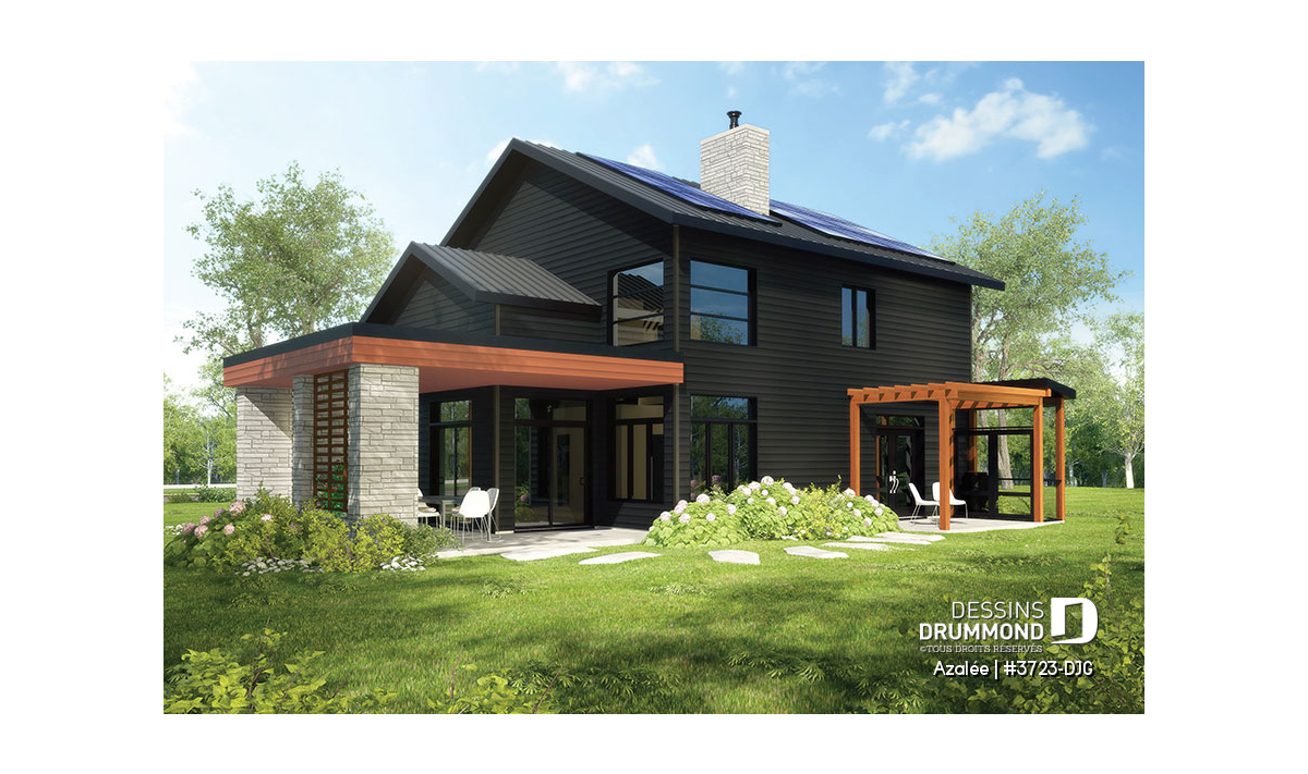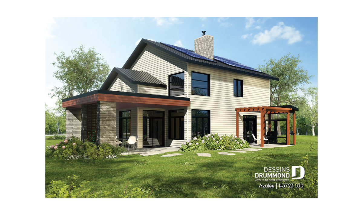 Avec ses touches de pierres naturelles et de bois, l’Azalée propose une architecture chaleureuse et actuelle, parfaitement adaptée aux familles d’aujourd’hui. Pensée pour tirer pleinement profit d’une orientation sud-ouest, la maison maximise les apports solaires naturels. Le plan peut d’ailleurs être inversé ou ajusté selon l’orientation de votre terrain. La pierre du foyer, stratégiquement positionnée, agit comme accumulateur de chaleur passive, tandis que les larges corniches de toit bloquent le soleil d’été tout en laissant entrer la chaleur hivernale. Les pentes de toit de 6/12, idéales pour l’installation de panneaux solaires, et la généreuse surface de toiture permettent même d’envisager l’alimentation du chauffe-eau et du système de chauffage.